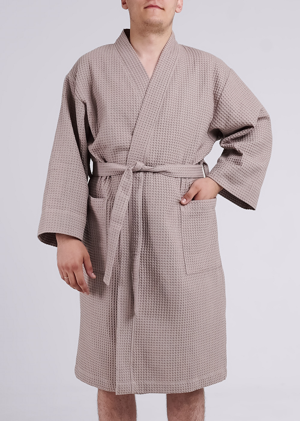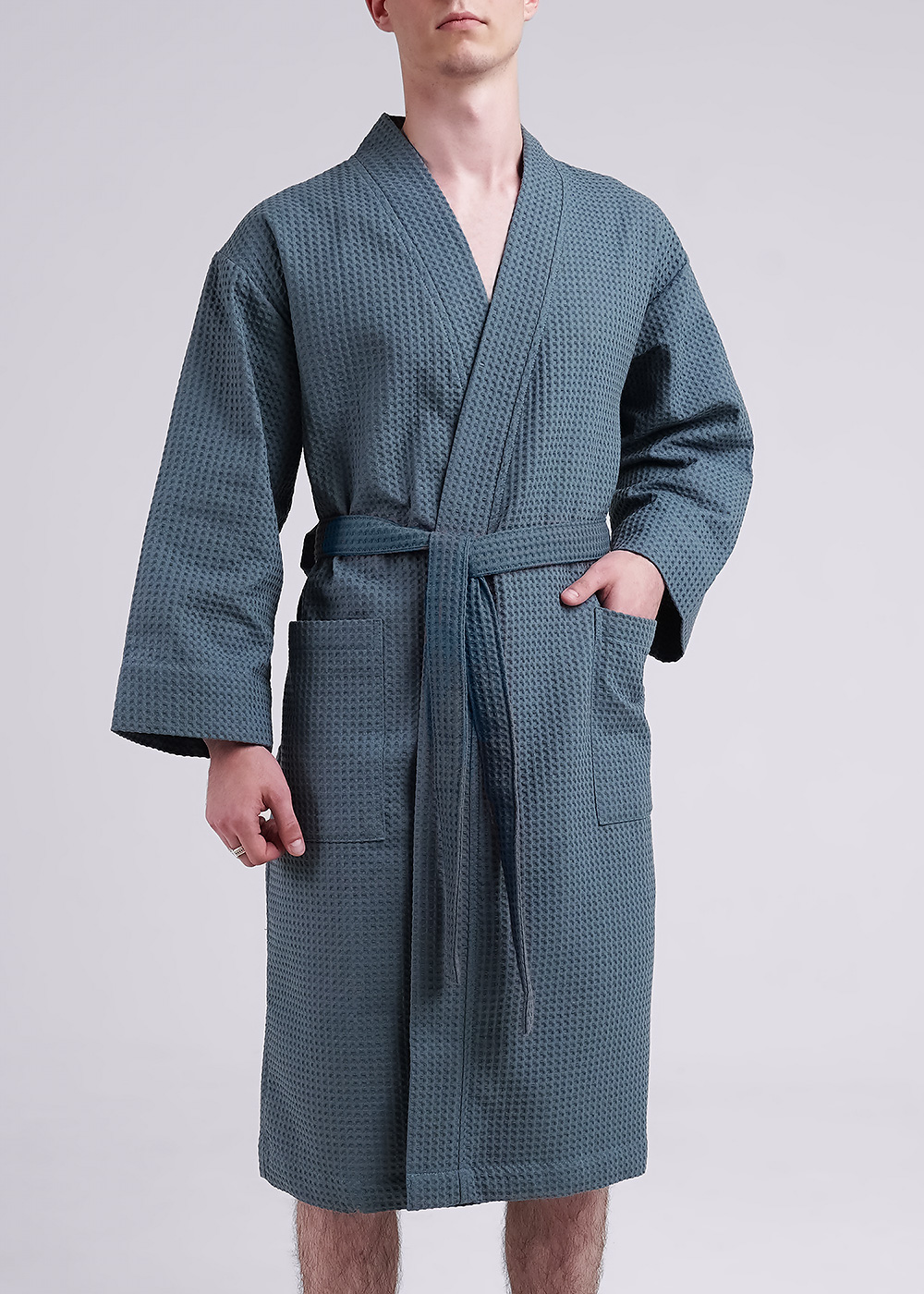 Классический мужской халат из вафельного полотна с приспущенной линией плеча. По бокам расположены карманы и предусмотрен функциональный пояс. Благодаря высокому качеству халат обеспечит комфорт и удобство дома, в бане или в бассейне.