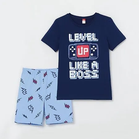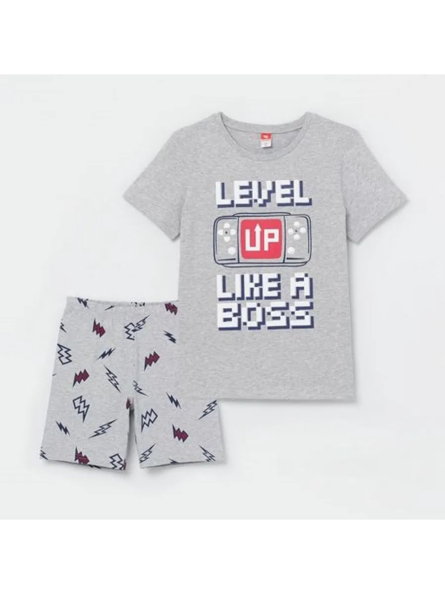 Комплект из футболки и шорт. Футболка с коротким рукавом. Горловина обработана притачной бейкой из рибаны с эластаном. Перед оформлен шелкографией. Шорты из набивного полотна длиной до колена. Цельнокроенный пояс обработан плоским швом вподгибку с одновременным прокладыванием резинки.