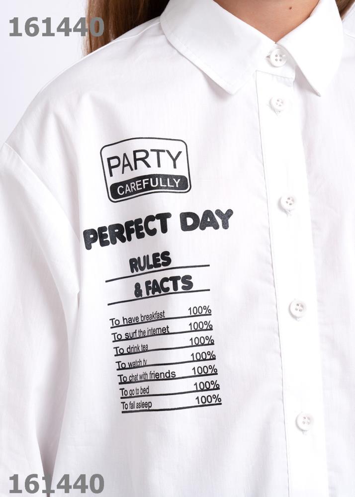Трендовая рубашка с акцентным принтом спереди выполнена из натурального хлопка. Рукав со спущенным плечом и манжетами, отложной воротник. По бокам изделия разрезы.100% хлопок