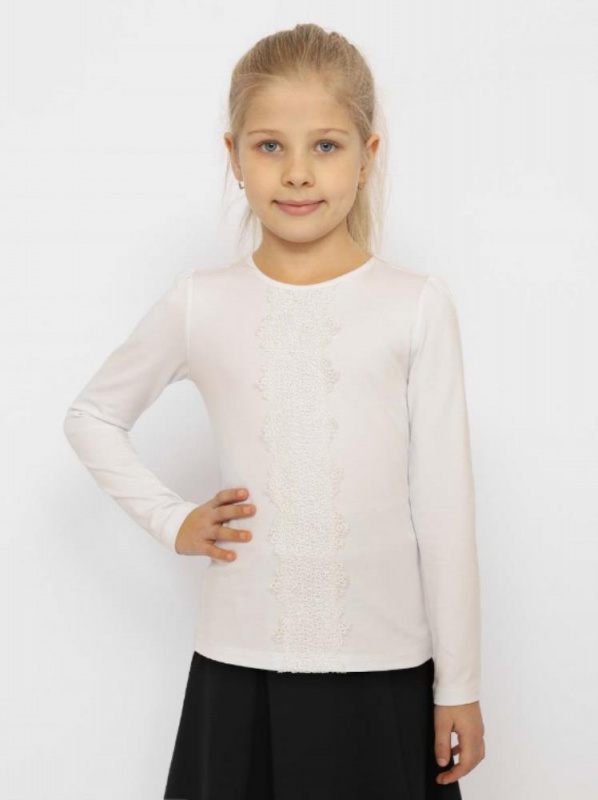 Кулирная гладь, 92% хлопок, 8% эластан / Джемпер для девочки с длинными рукавами. Полочка декорированя кружевом. Рукава со сборкой по окату. Горловина окантована.