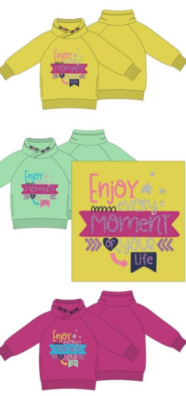 Худи для девочки с высоким воротником из основного полотна и карманами в боковых швах. По краю воротника обработаны декоративные элементы из ленты котрастного цвета. Рукава "реглан", длинные, с манжетами по низу. Нижние срезы переда и спинки обработаны притачным поясом. Перед декорирован принтом.