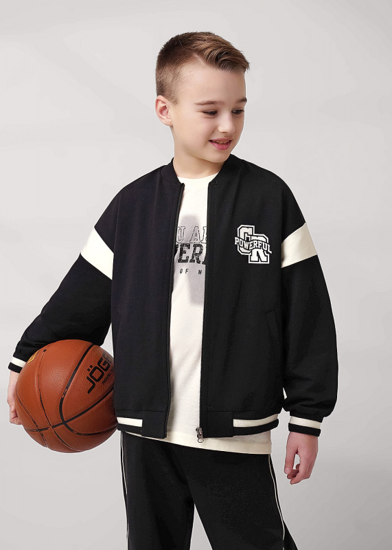 Стильный бомбер из мягкого футера отлично подойдёт для активных игр и повседневных образов. Контрастная отделка по низу модели и манжетам, декоративные вставки на плечах, функциональные карманы. Сочетай бомбер с брюками из новой коллеции и будь в тренде!