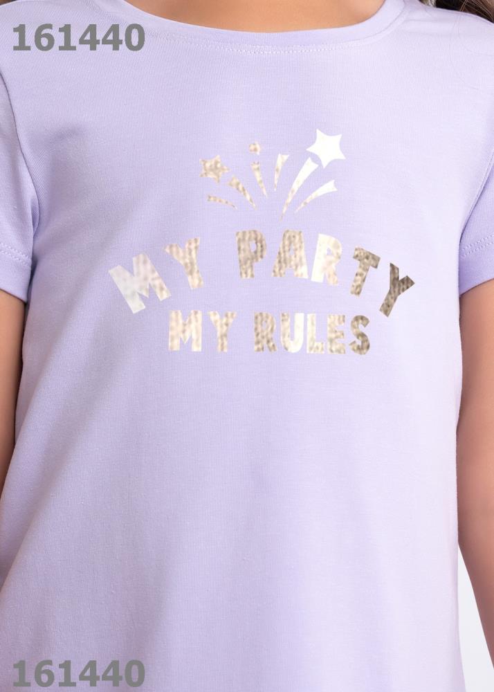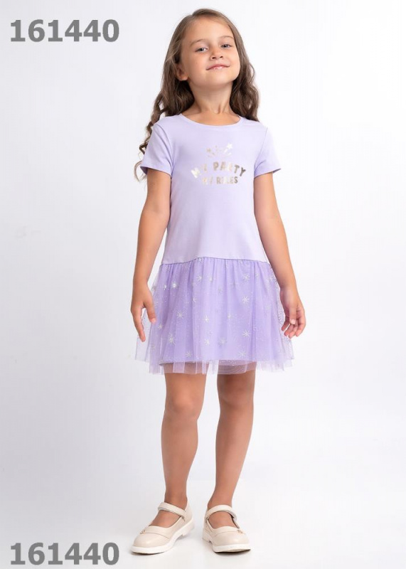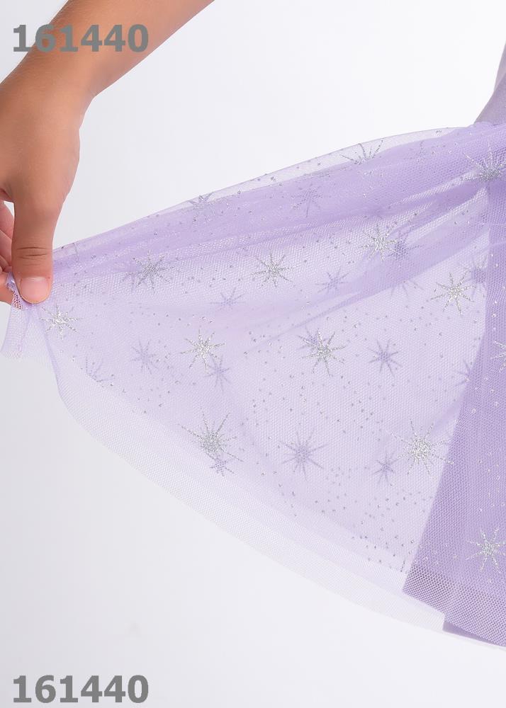 Нарядное платье с блестящим принтом для девочки. Короткий рукав. Выполнено из эластичного трикотажа, низ - пышная юбка, верхний слой из сетки с мерцающим рисуноком.