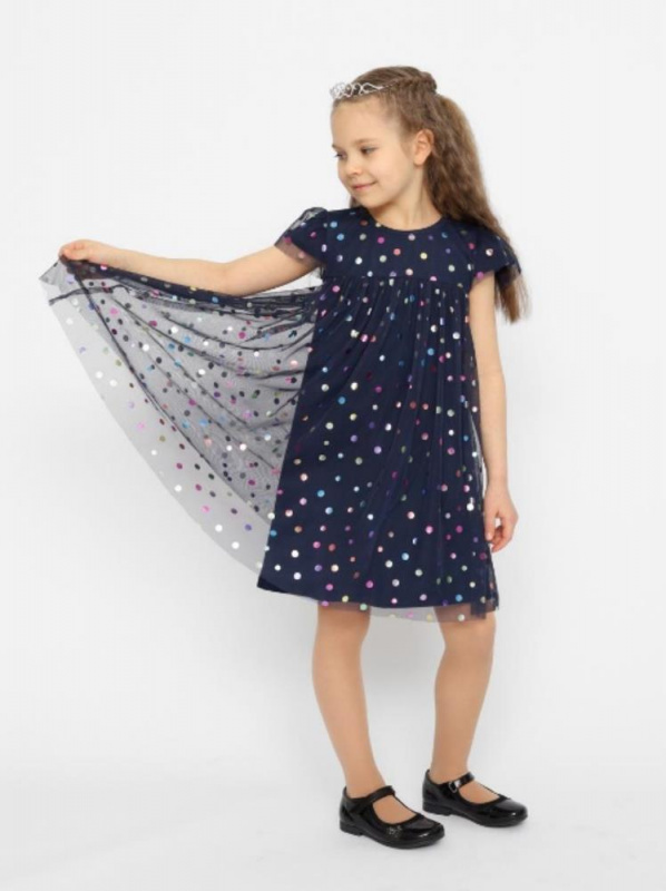 Кулирная гладь, 92% хлопок, 8% эластан; Сетка, 100% полиэстер / Нарядное платье свободного силуэта с короткими рукавами. Нижний слой платья из хлопковой кулири. Верхний слой платья из сетки с блестящими кружочками "конфетти". Сзади застежка на пуговицы.