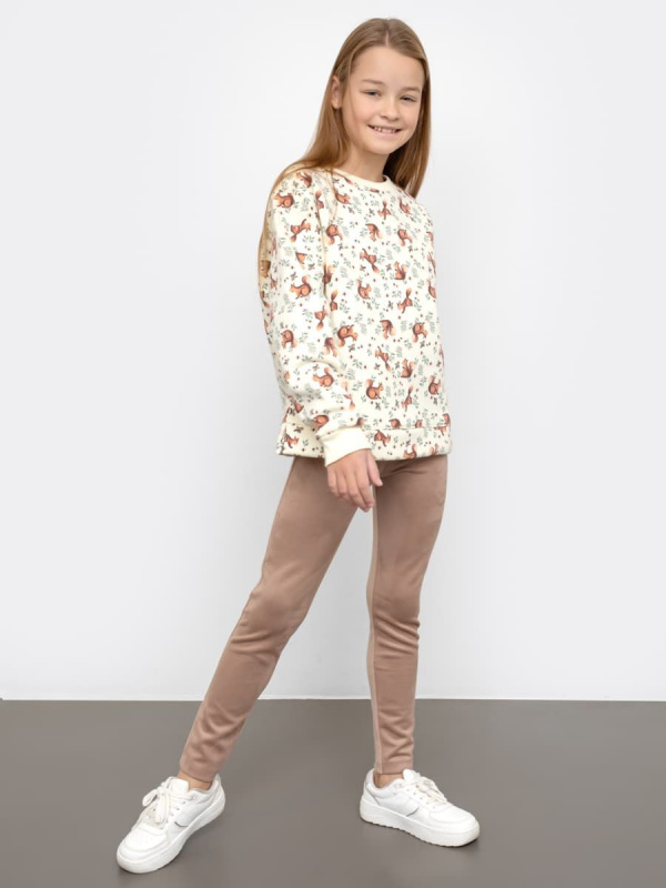 Стильные леггинсы для девочек. Передняя часть выполнена из трикотажного полотна под замшу, задняя – из трикотажного полотна академик. В поясе – жаккардовая эластичная тесьма, отогнутая внутрь. Слегка завышенная посадка дарит комфорт. Нижние срезы с плоскими швами. Функционально и комфортно!