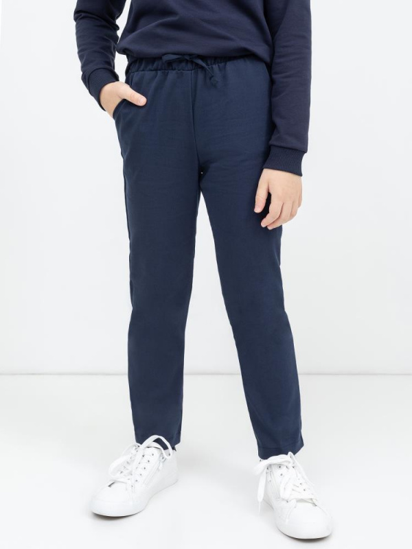 Брюки прямого силуэта. Посадка средняя. Отрезной пояс с эластичной тесьмой внутри и шнуром из основного полотна. На передних половинках обработаны карманы с наклонным входом от боковых швов. Низ изделия обработан швом в подгибку.