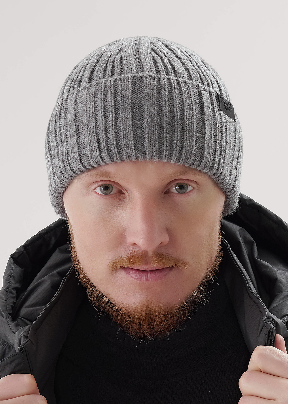 Шапка мужская с отворотом, с подкладом из флиса. Выполнена из высококачественной пряжи с добавлением шерсти, декорирована стильной нашивкой. Станет не только отличной защитой от холода, но и модным аксессуаром.