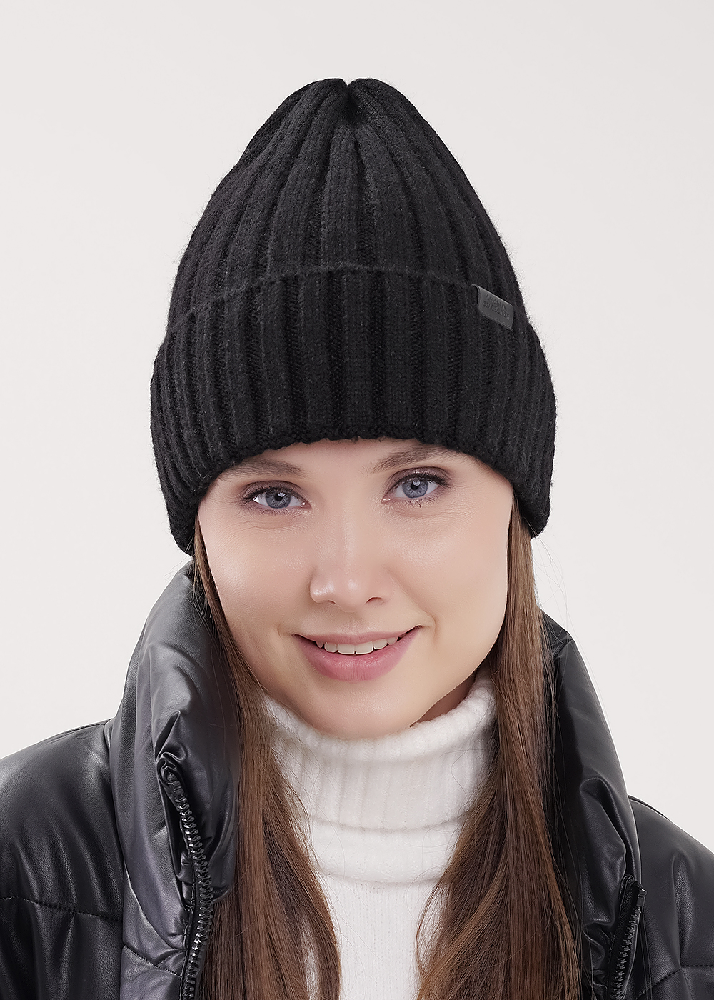 Женская шапка с отворотом, утеплена флисом по всей голове. Выполнена из высококачественной пряжи, декорирована стильной нашивкой. Станет не только отличной защитой от холода, но и модным аксессуаром.