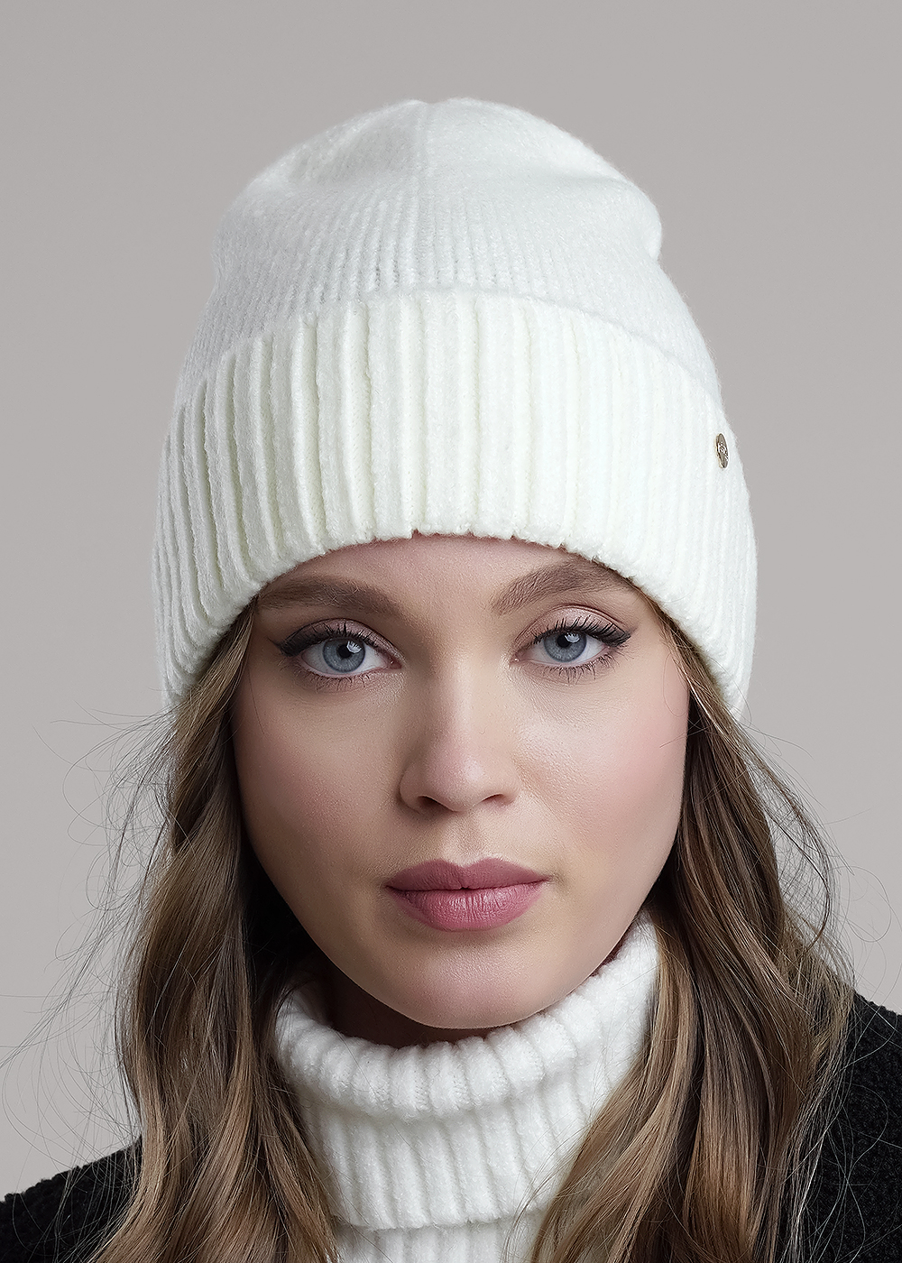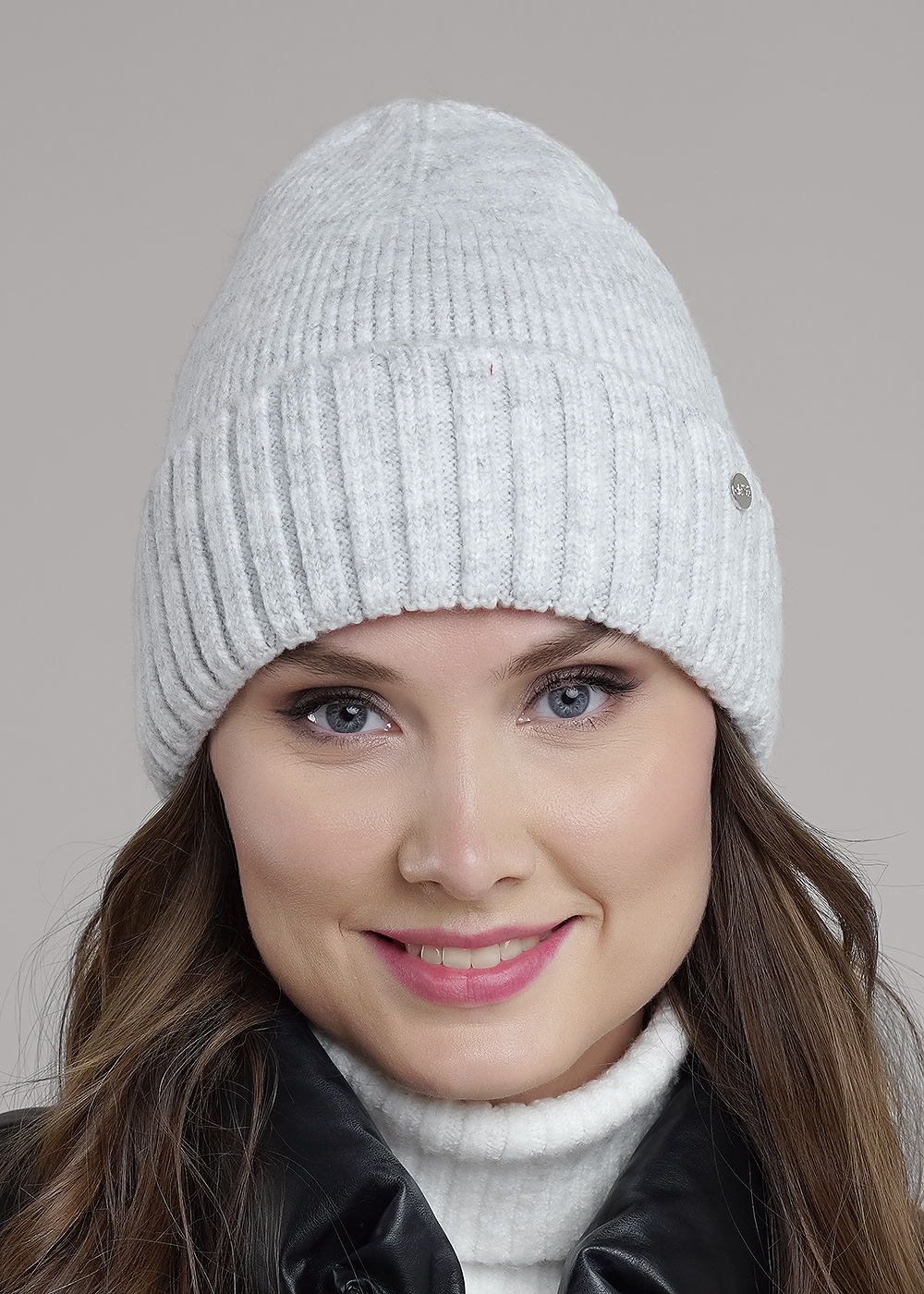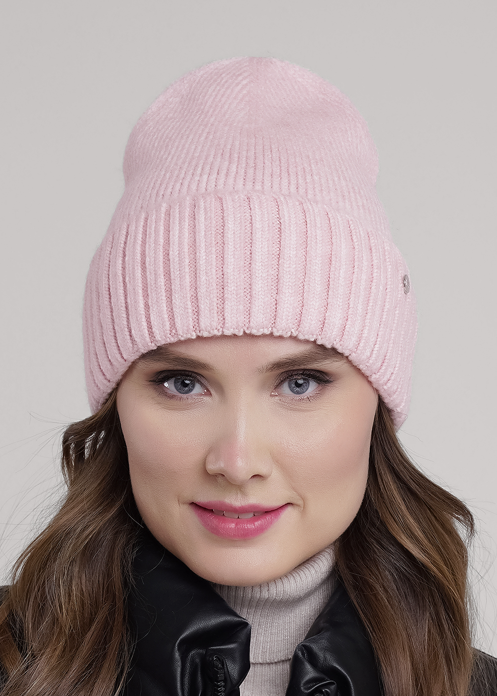 Шапка женская однослойная с отворотом, без подклада. Выполнена из высококачественной пряжи, декорирована стильной нашивкой. Станет не только отличной защитой от холода, но и модным аксессуаром.