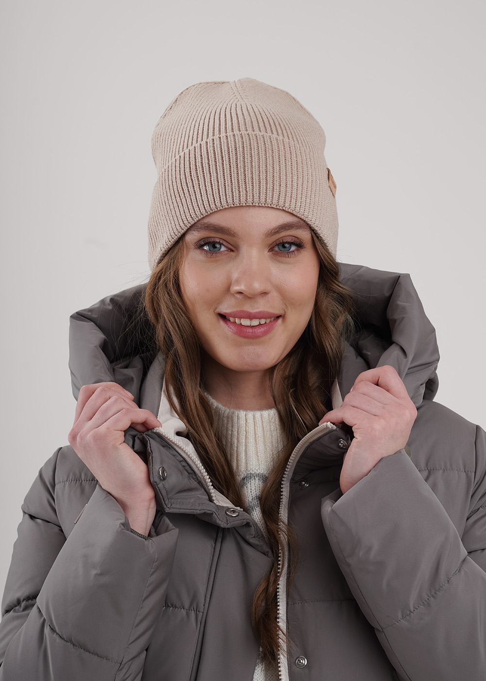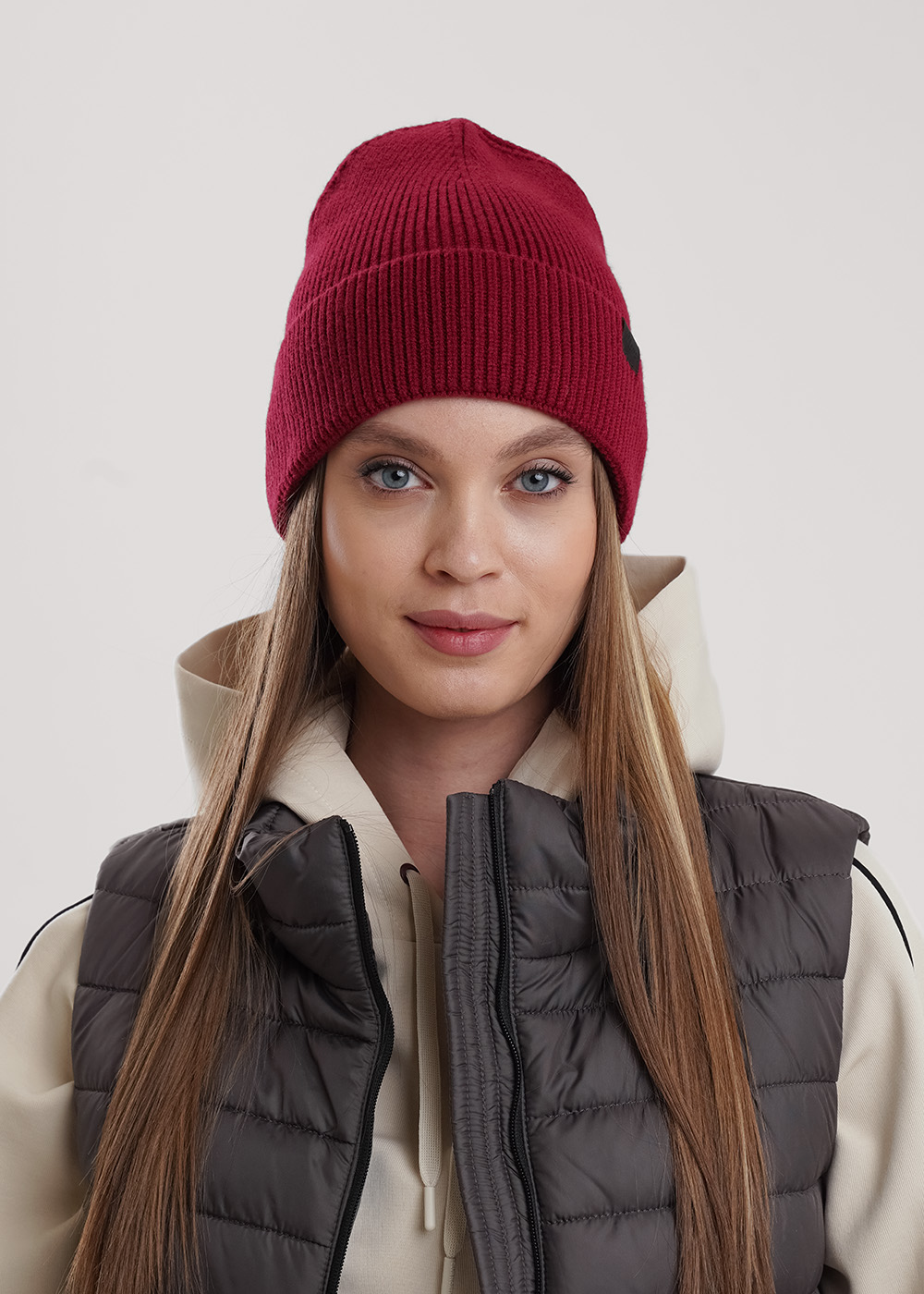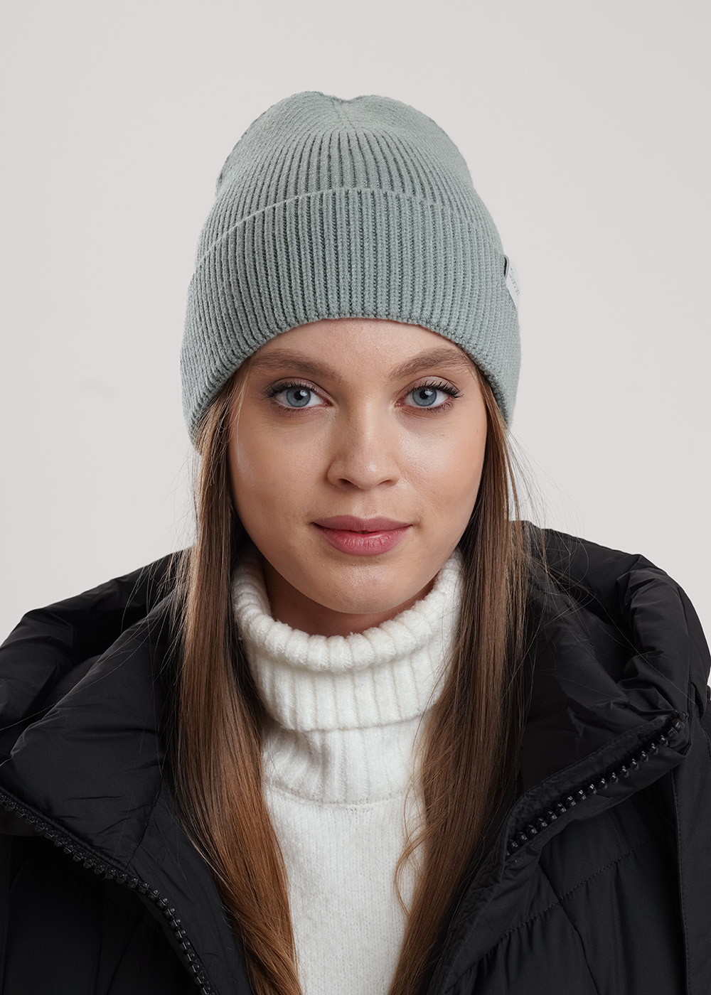 Шапка женская однослойная с отворотом, без подклада. Декорирована стильной нашивкой. Станет не только отличной защитой от холода, но и модным аксессуаром.