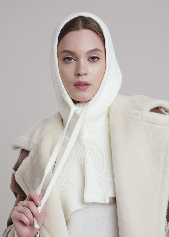 Женский однослойный капюшон на завязках. Приятен на ощупь и совсем не колется. Капор может заменить сразу и шапку, и шарф, надежно защитив от холода и ветра в любую непогоду.