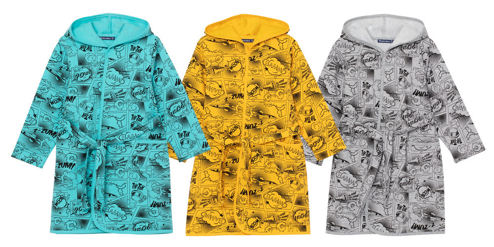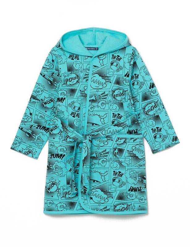 Халат для мальчика с капюшоном и длинными втачными рукавами, выполнен из набивного футерованного полотна с начесом. Халат без застёжки, запах фиксируется поясом. Край капюшона, борта и низ изделия обработаны бейкой, на полочке накладной карман, в боковых швах шлевки для пояса.