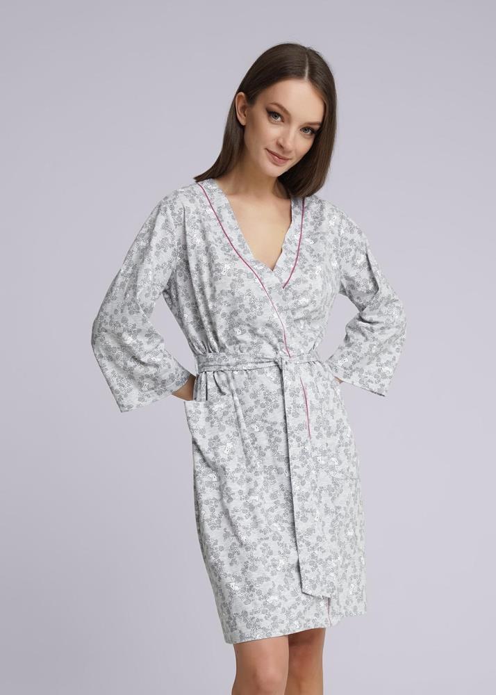 Халат на запах с поясом для дома из трикотажного меланжевого полотна с хлопком в составе. Рукав длиной 3/4. По борту контрастный кант. По переду накладные карманы.