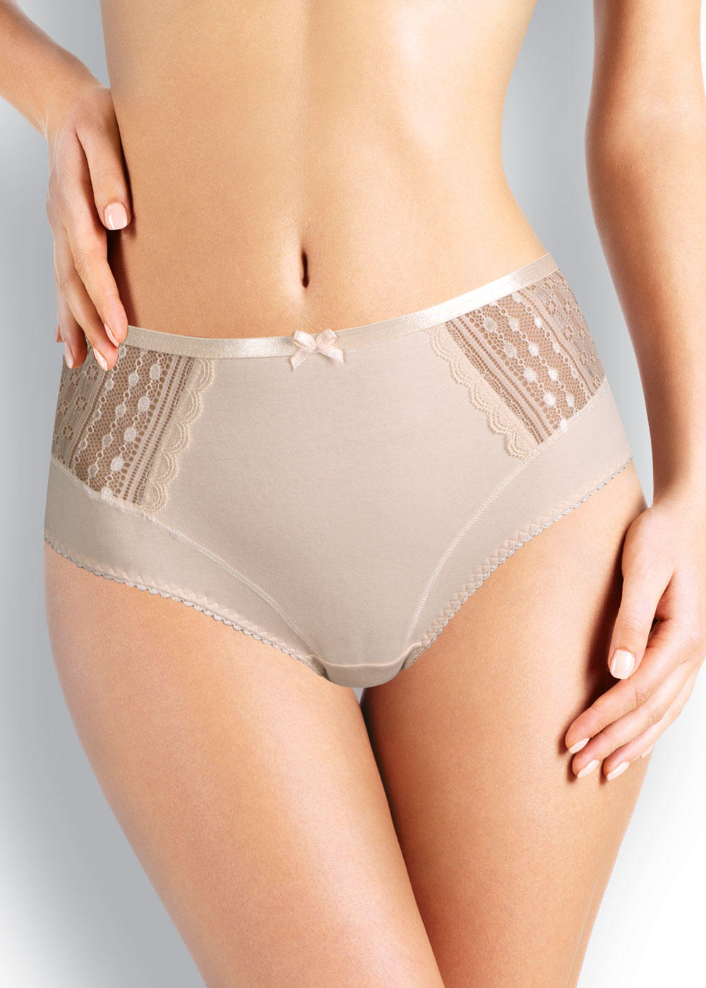 Трусы макси женские из плотного эластичного хлопкового полотна. Обработка краев - ажурной резинкой с фестоном. По переду вставки из кружева и бант.