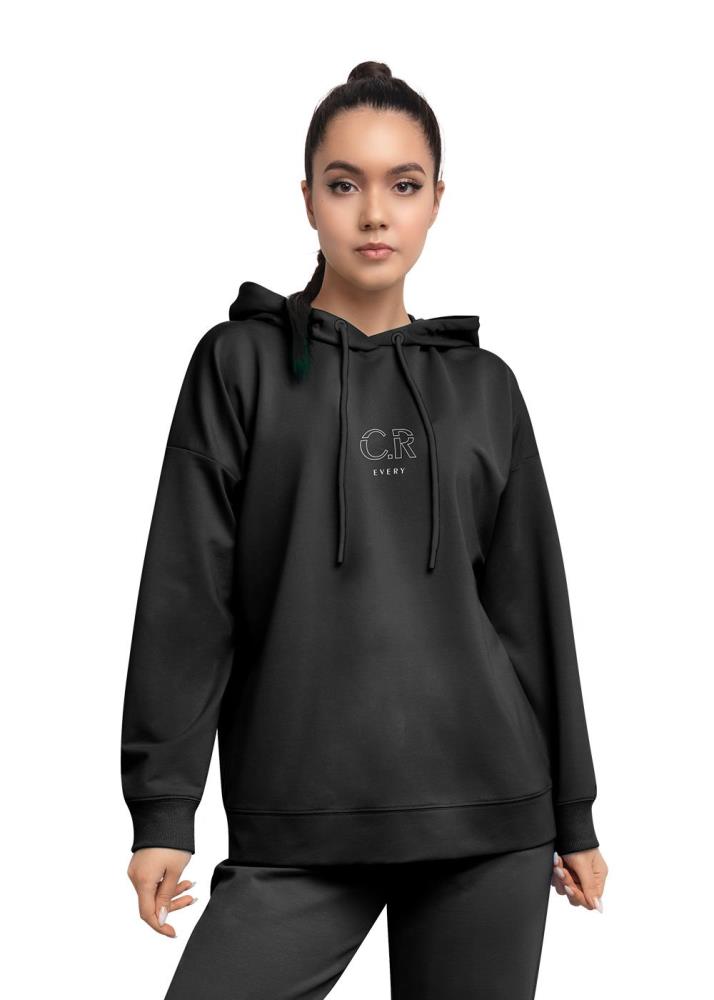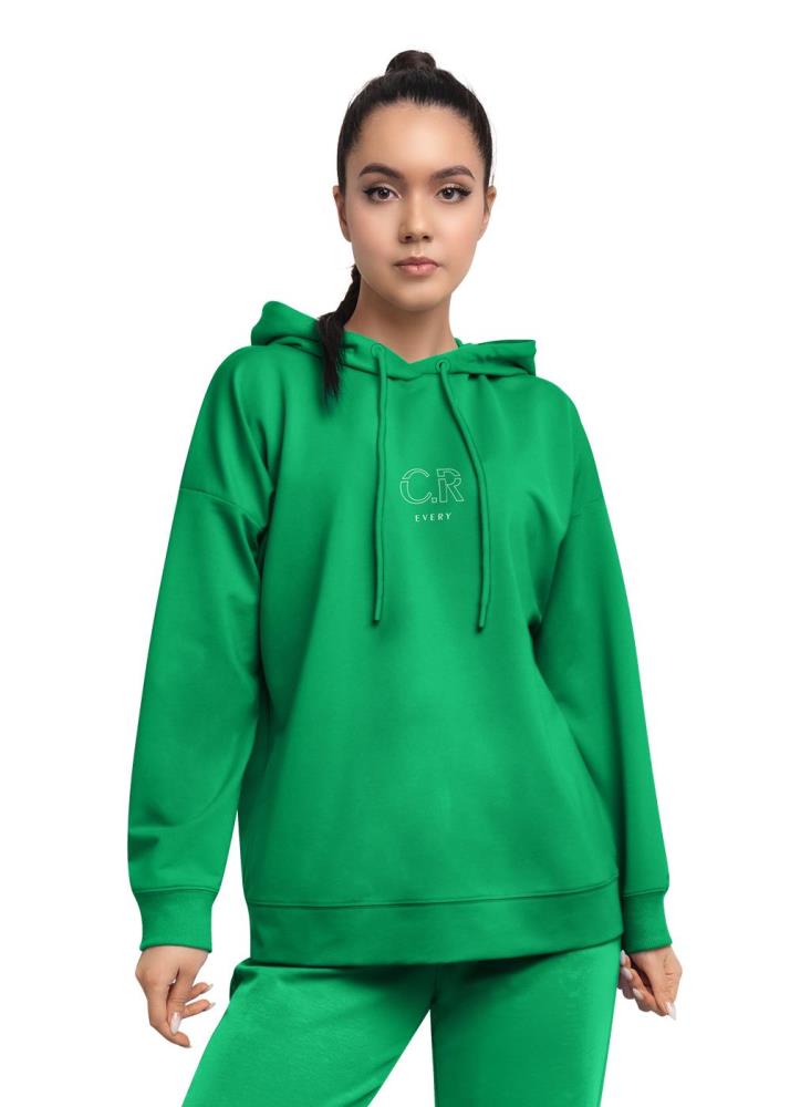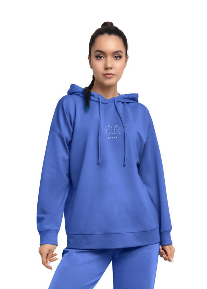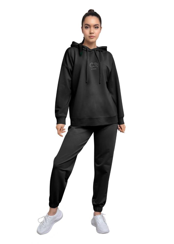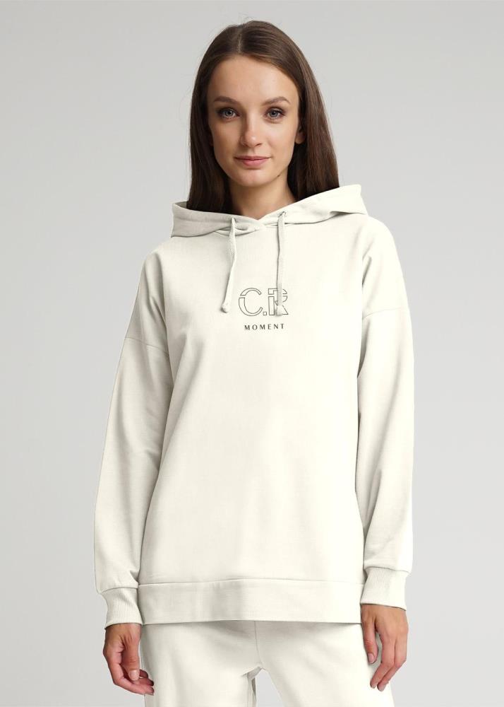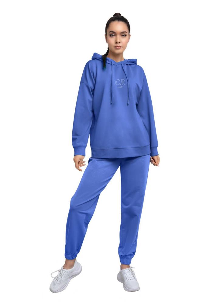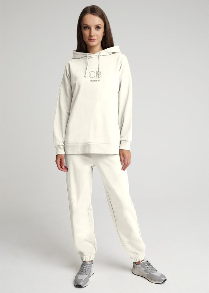 Комплект из трикотажного полотна футер 2-х нит.Толстовка со спущенной линией плеча. По горловине капюшон со шнуром. По низу изделия,рукавов манжеты.Спереди принт.Брюки свободного кроя с внутренней резинкой по талии и низу, в боковых швах карманы.