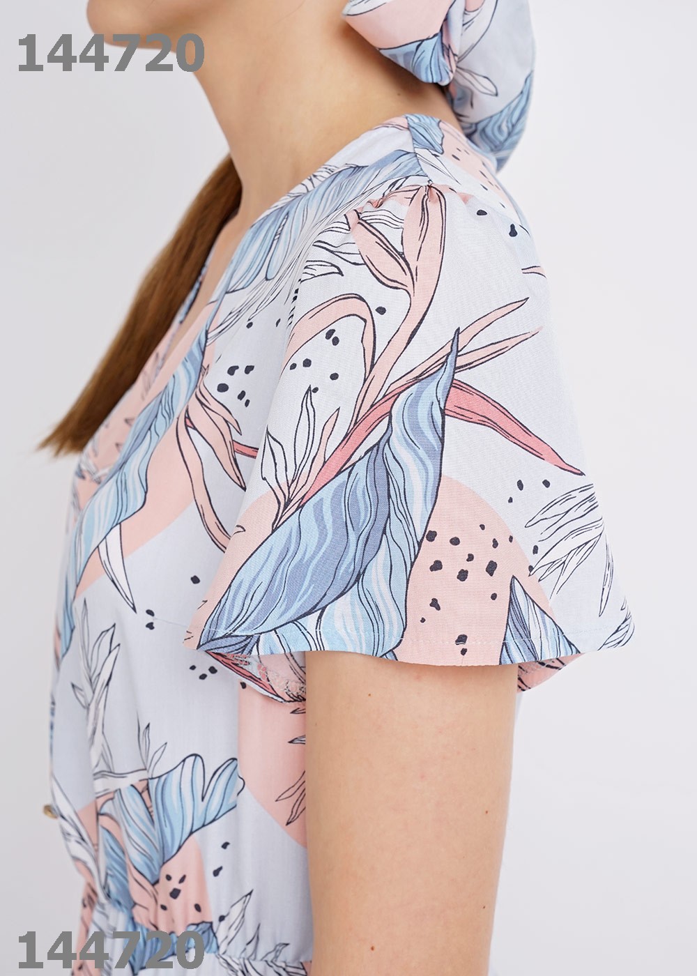 Платье отрезное по талии на набивном полотне "штапель" с V-образым вырезом и расклешённым коротким рукавом со сборкой. В талии резинка. Застёжка планка на пуговицы. Длина изделия ниже колена.