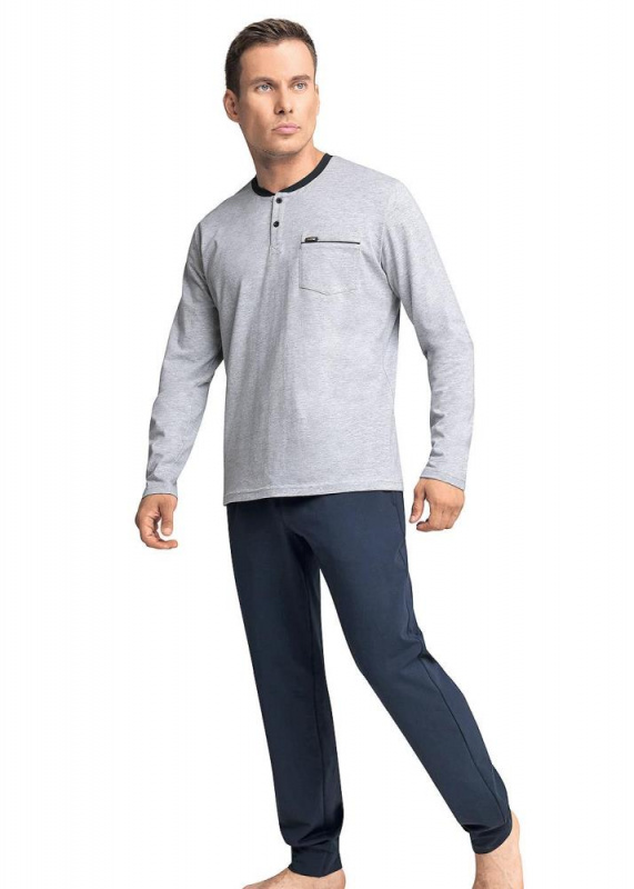 Комплект мужской для дома, состоящий из джемпера и брюк. Джемпер из трикотажного полотна с карбоном, планкой на 2 пуговицы, контрастной горловиной и карманом с имиджевой нашивкой. Брюки из плотного трикотажа на эластичном поясе с шнуром и карманами.