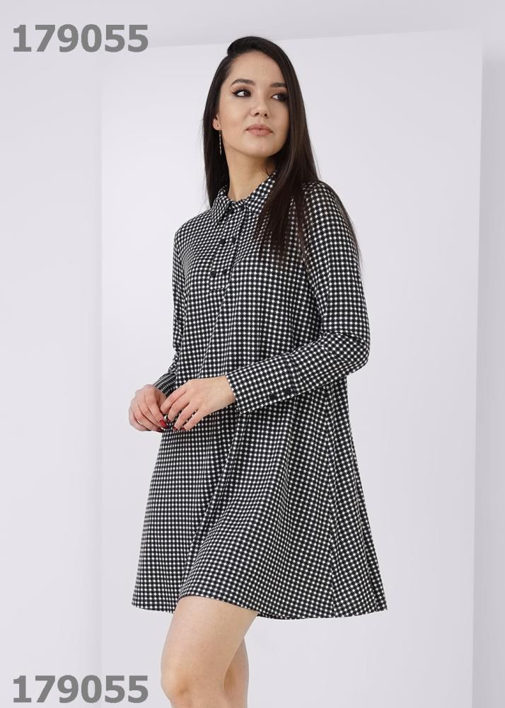 Платье из вискозного трикотажного полотна,немного расклешенное книзу.Длиной ниже колена.По горловине отложной воротник.Спереди притачная планка, застежка на пуговицы в два ряда.тВтачной длинный рукав,по низу рукава высокий манжет с застежкой на пуговицы.