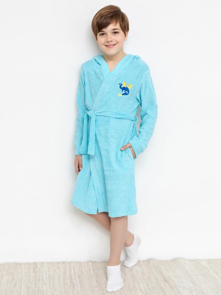 Махровый халат для мальчиков. Силуэт прямой, длина ниже коленей. Халат с запахом, со съемным поясом. Имеется уютный капюшон и вместительные боковые карманы. Комфортный халат!