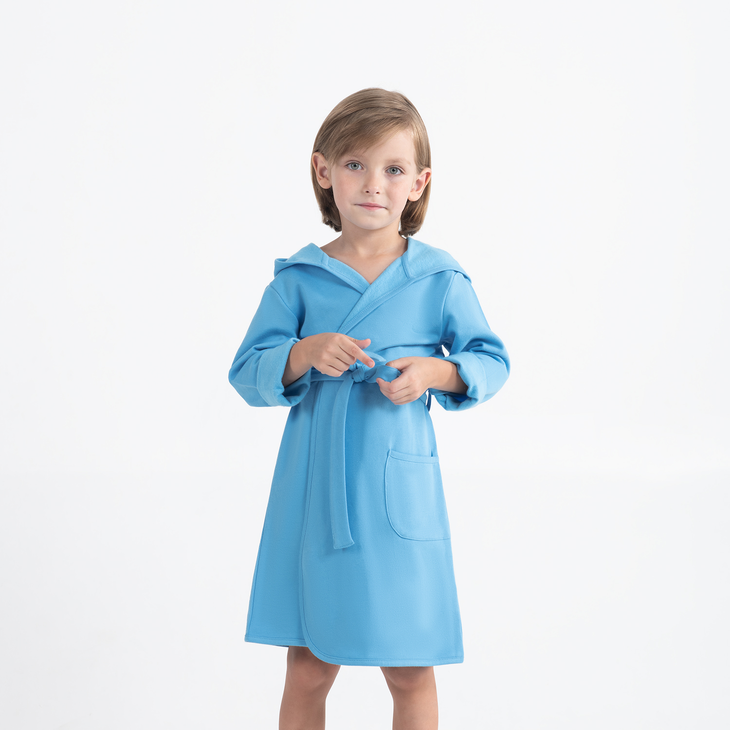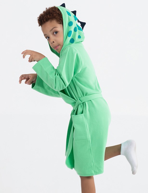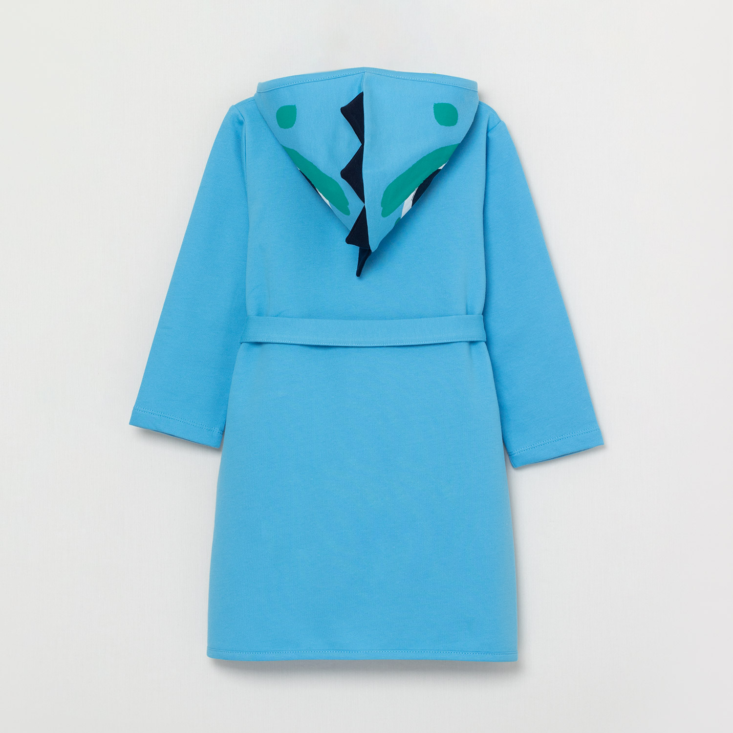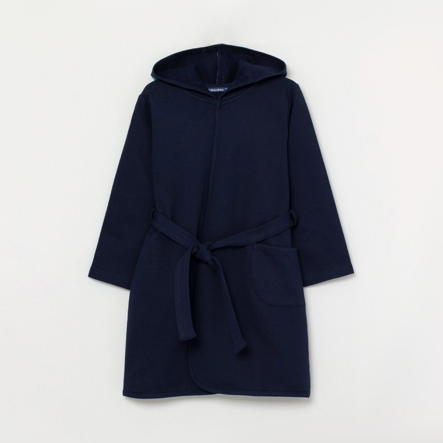 Халат для девочки с капюшоном и длинными втачными рукавами, выполнен из футерованного полотна с начесом. Халат без застёжки, запах фиксируется поясом. Край капюшона, борта и низ изделия обработаны бейкой, на полочке накладной карман, в боковых швах шлевки для пояса. Капюшон декорирован принтом и вставленным в шов "гребешком".