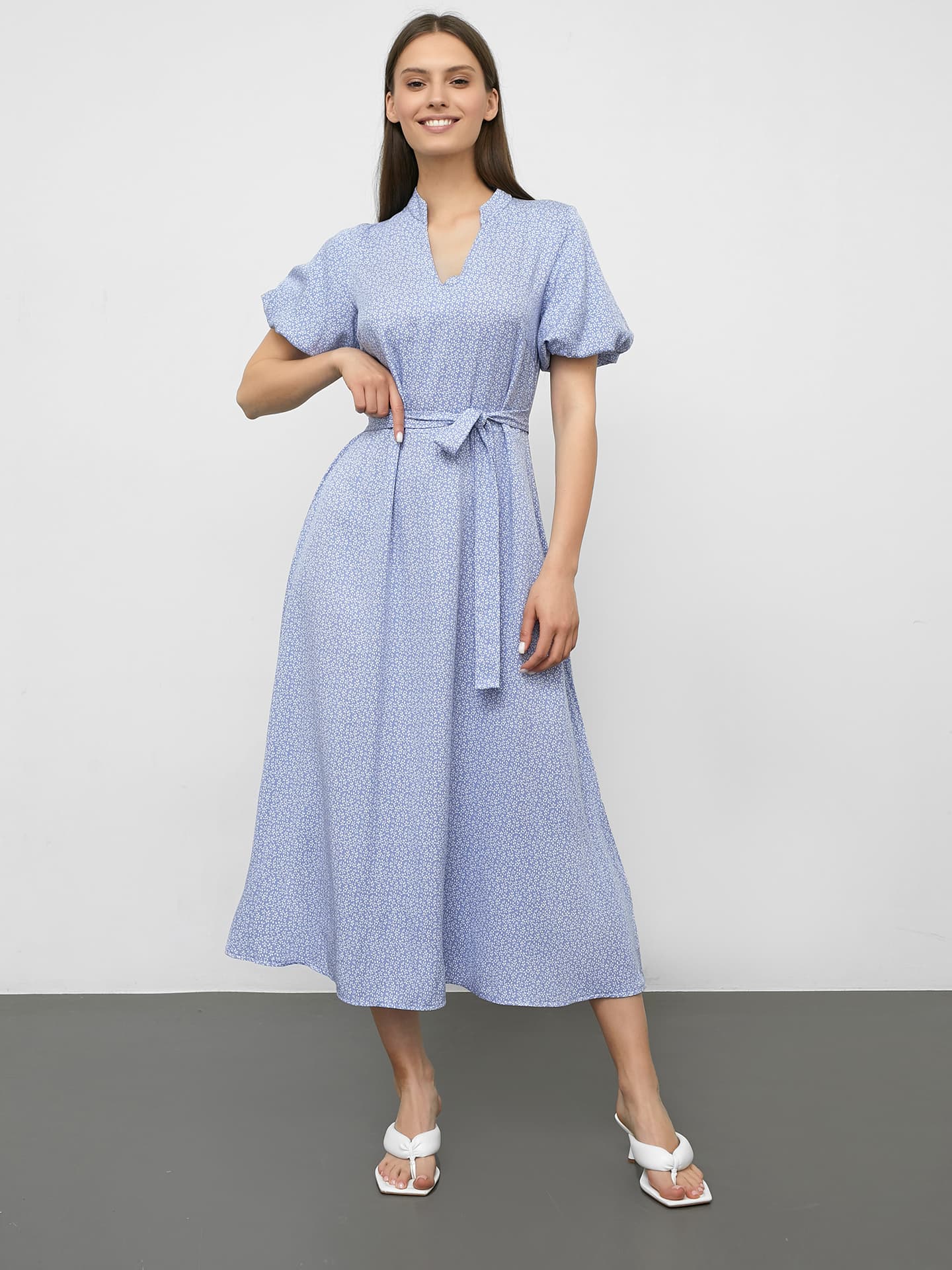 Очаровательное женское платье из нежной и лёгкой высококачественной вискозы — идеальный выбор для ярких летних дней. Макси расширяется к низу, талия подчёркнута широким поясом. Рукава-фонарики длиной дo локтя. Длина модели ниже колена.