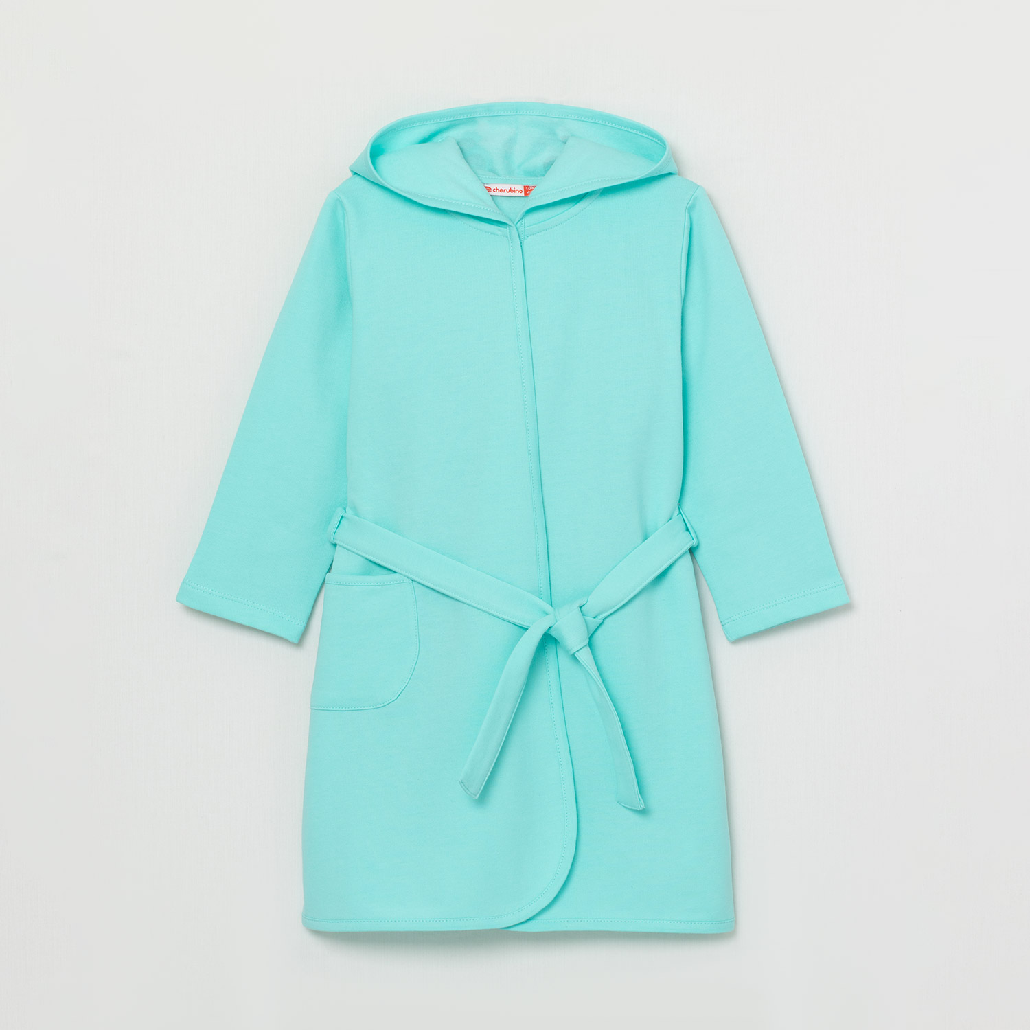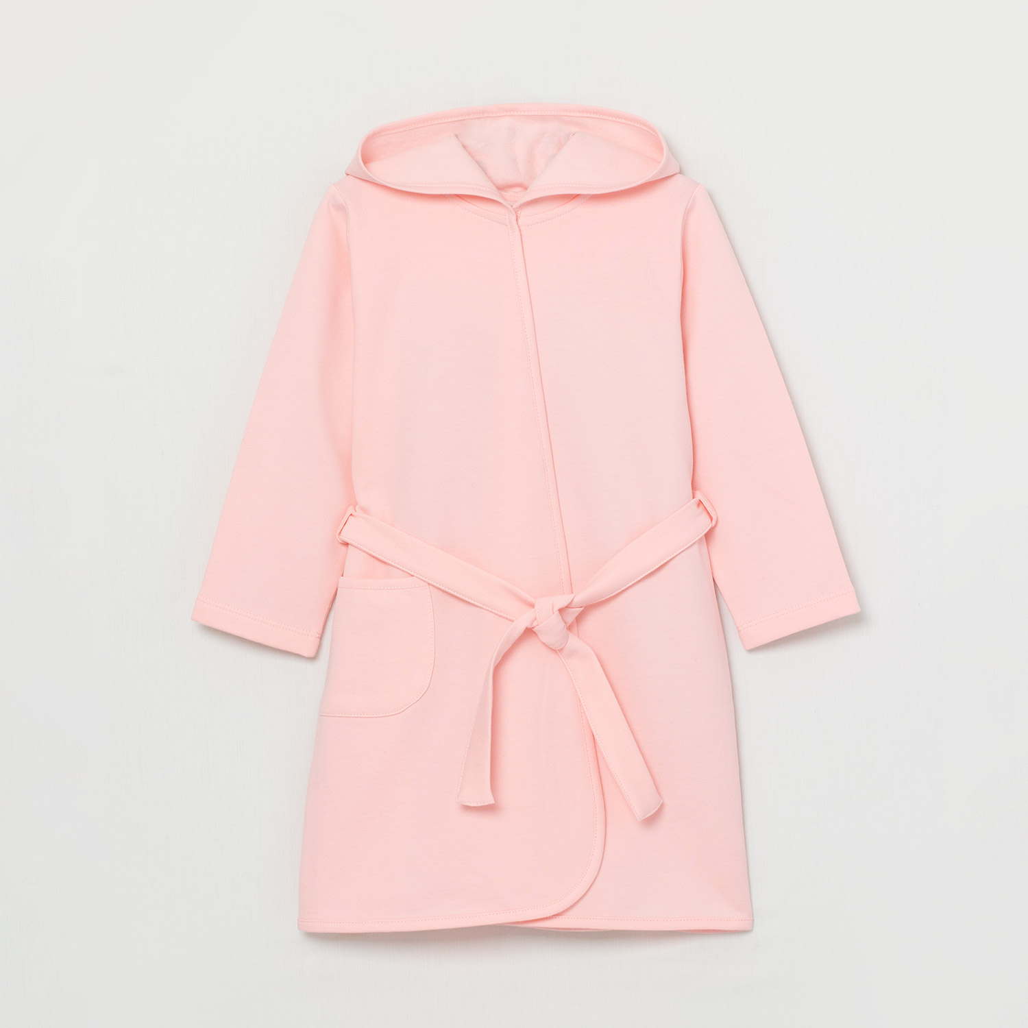 Халат для девочки с капюшоном и длинными втачными рукавами, выполнен из гладкого футерованного полотна с начесом. Халат без застёжки, запах фиксируется поясом. Край капюшона, борта и низ изделия обработаны бейкой, на полочке накладной карман, в боковых швах шлевки для пояса. На капюшоне принт в виде мордочки кошки, и вшитые декоративные ушки.