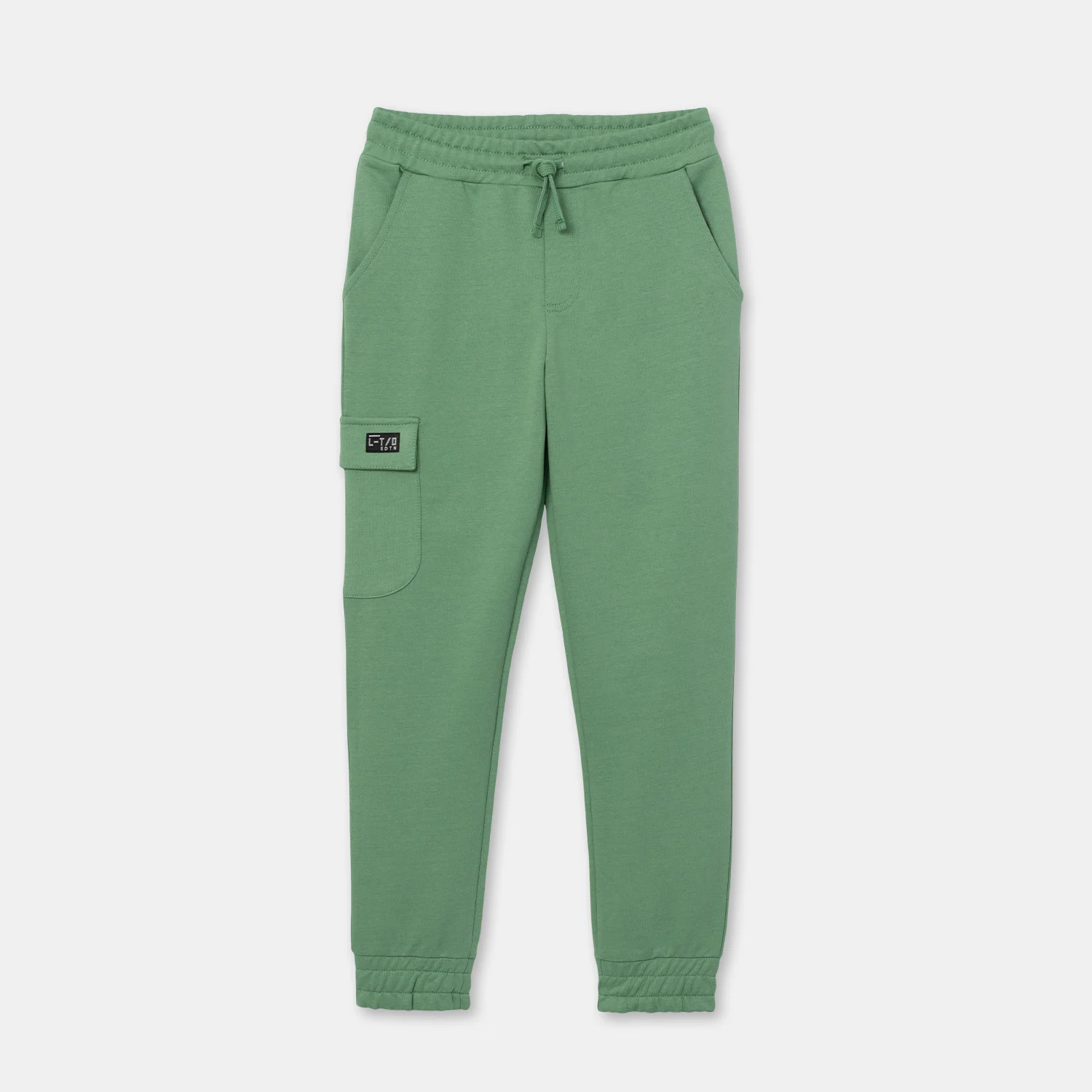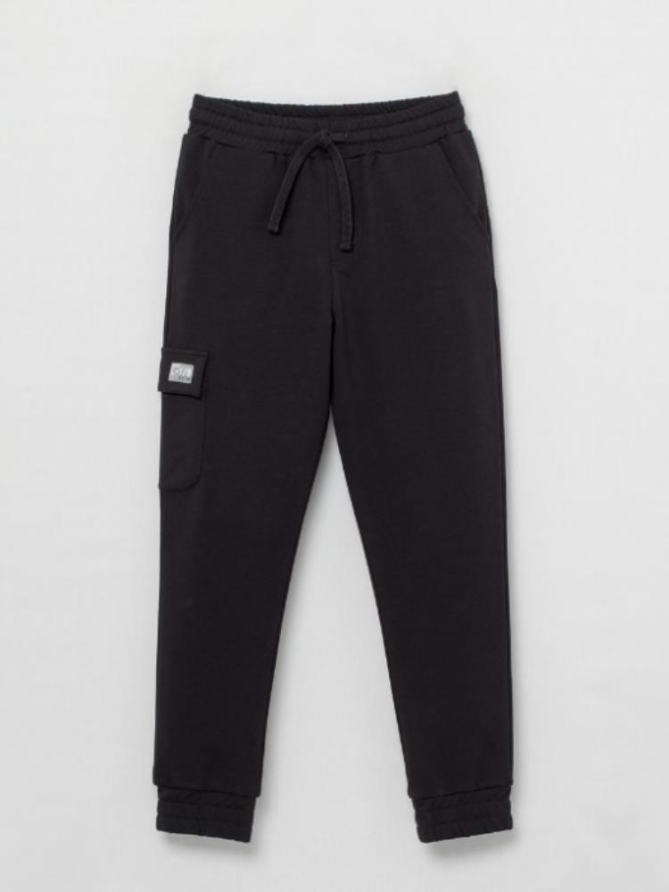Брюки для мальчика с боковыми карманами. На правой половинке брюк также обработан накладной карман с клапаном. Пояс притачной, с резинкой и функциональным шнуром. Нижние срезы брюк обработаны манжетами из основного полотна со вставленной внутрь резинкой. На клапан кармана настрочена декоративная жаккардовая этикетка.