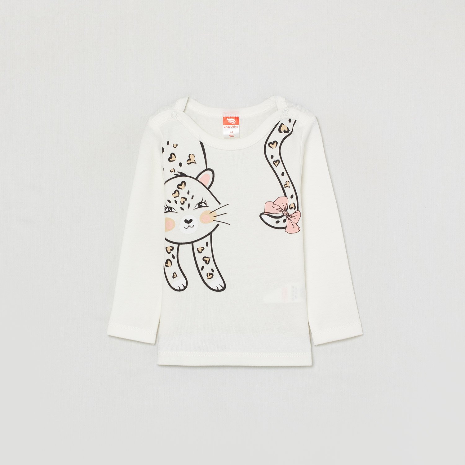 Джемпер из гладкокрашеной рибаны с застежкой на кнопки с двух сторон горловины. Горловина и плечевые срезы окантованы бейкой из основного полотна. Низ джемпера и рукавов обработан плоским швом вподгибку. Перед оформлен принтом.