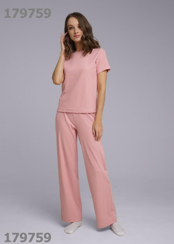 Комплект для дома из хлопкового трикотажного полотна кашкорсе. Футболка с коротким втачным рукавом и круглой горловиной. По низу перламутровая нашивка. Брюки с цельнокроеным поясом на внутренней резинке.