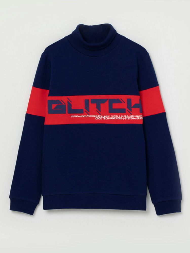 Водолазка для мальчика с длинными рукавами. Воротник с отворотом, манжеты и пояс выполнены из эластичного полотна. По переду, спинке и рукавам на уровне груди - декоративные втавки дополнительного цвета. Вставка переда декорирована принтом с эффектом "пуфф".