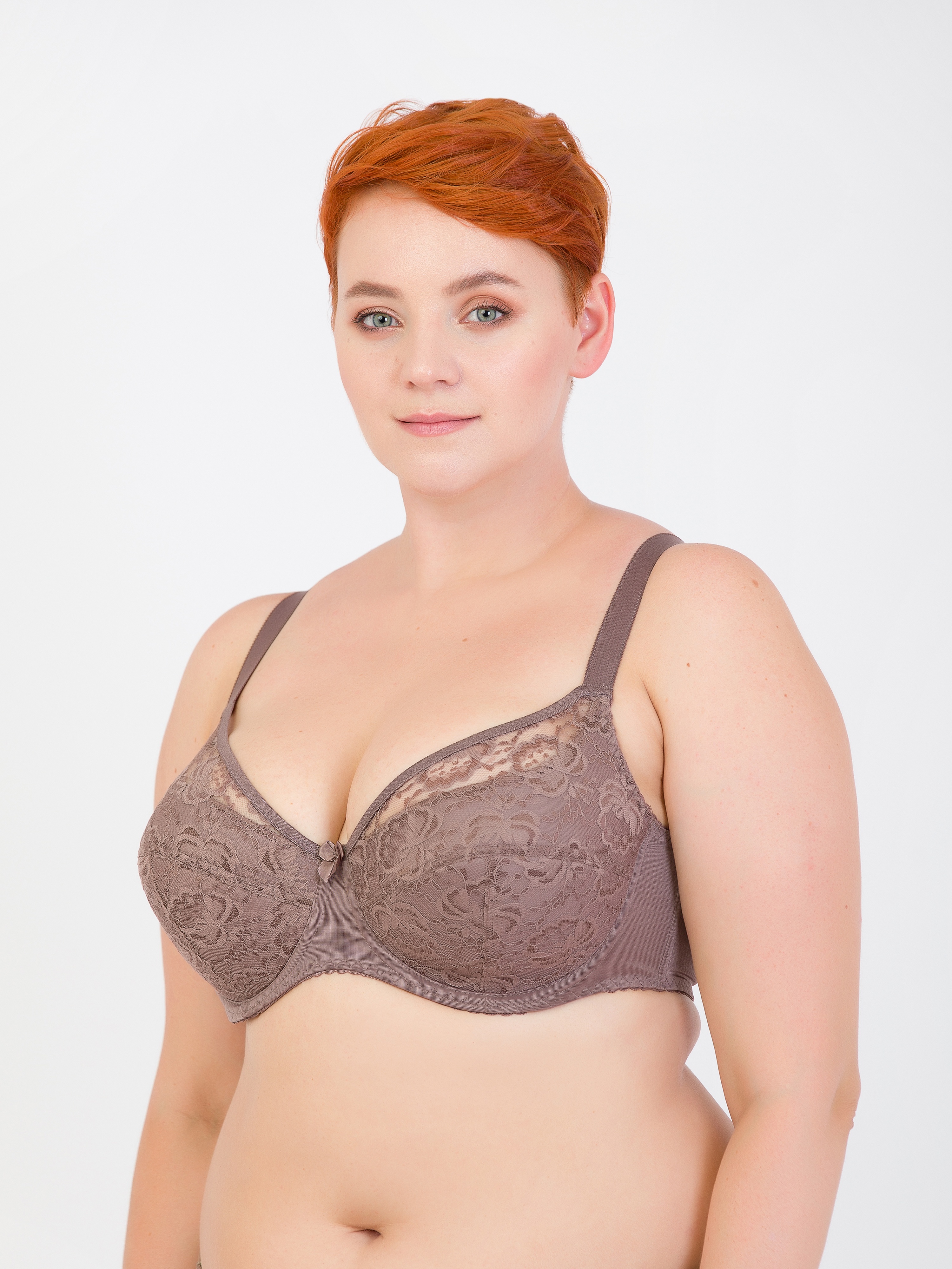 Бюстгальтер с поролоновыми Т-образными чашечками на каркасе, комбинированы кружевным полотном. Внутренняя часть продублирована мягким хлопком. Боковая деталь имеет корректор на кости.