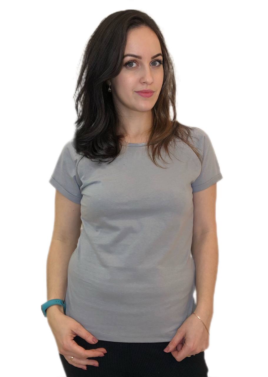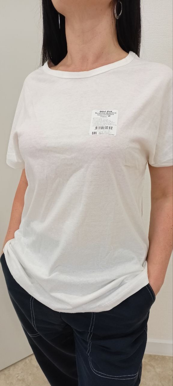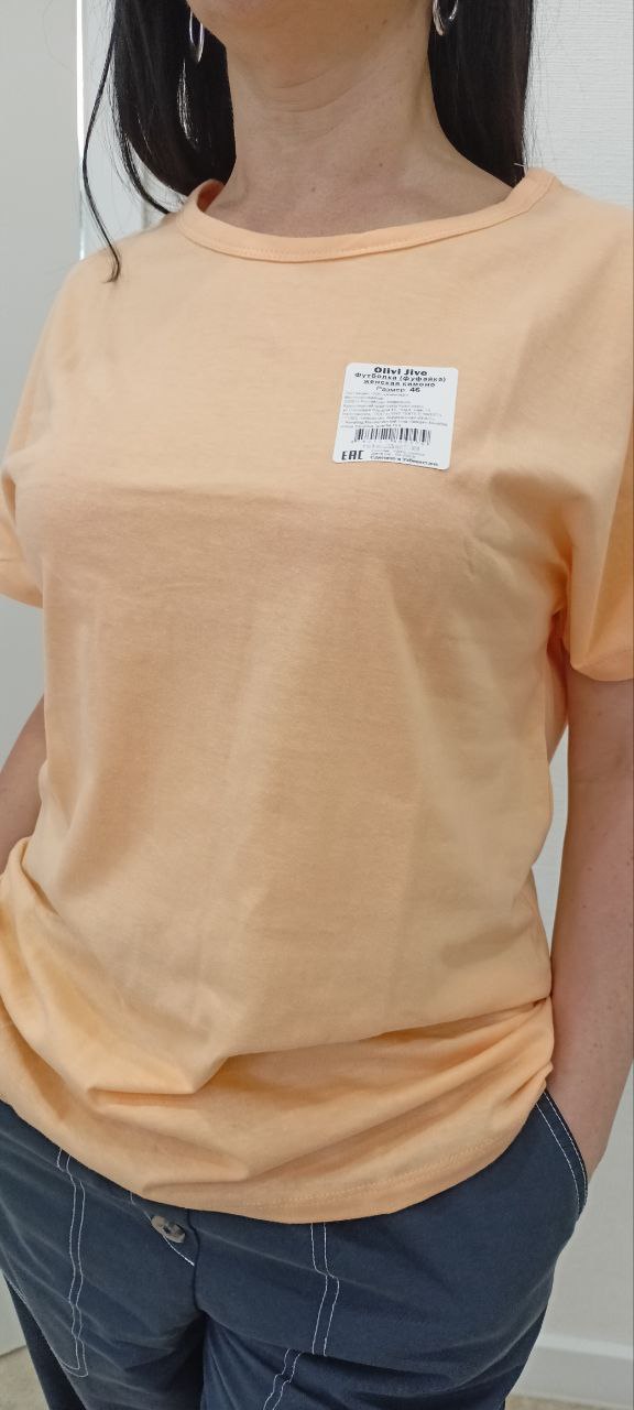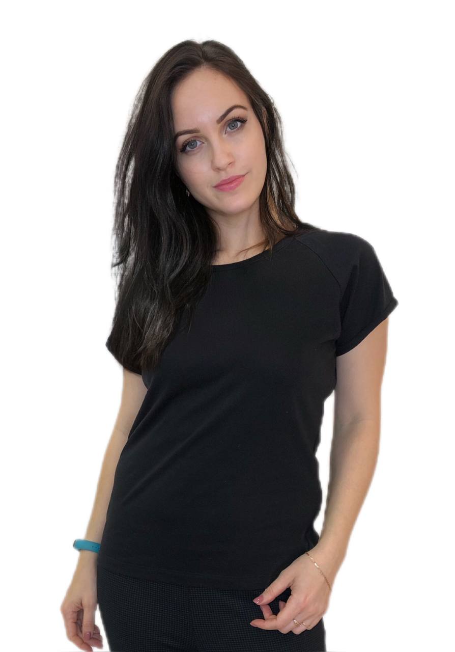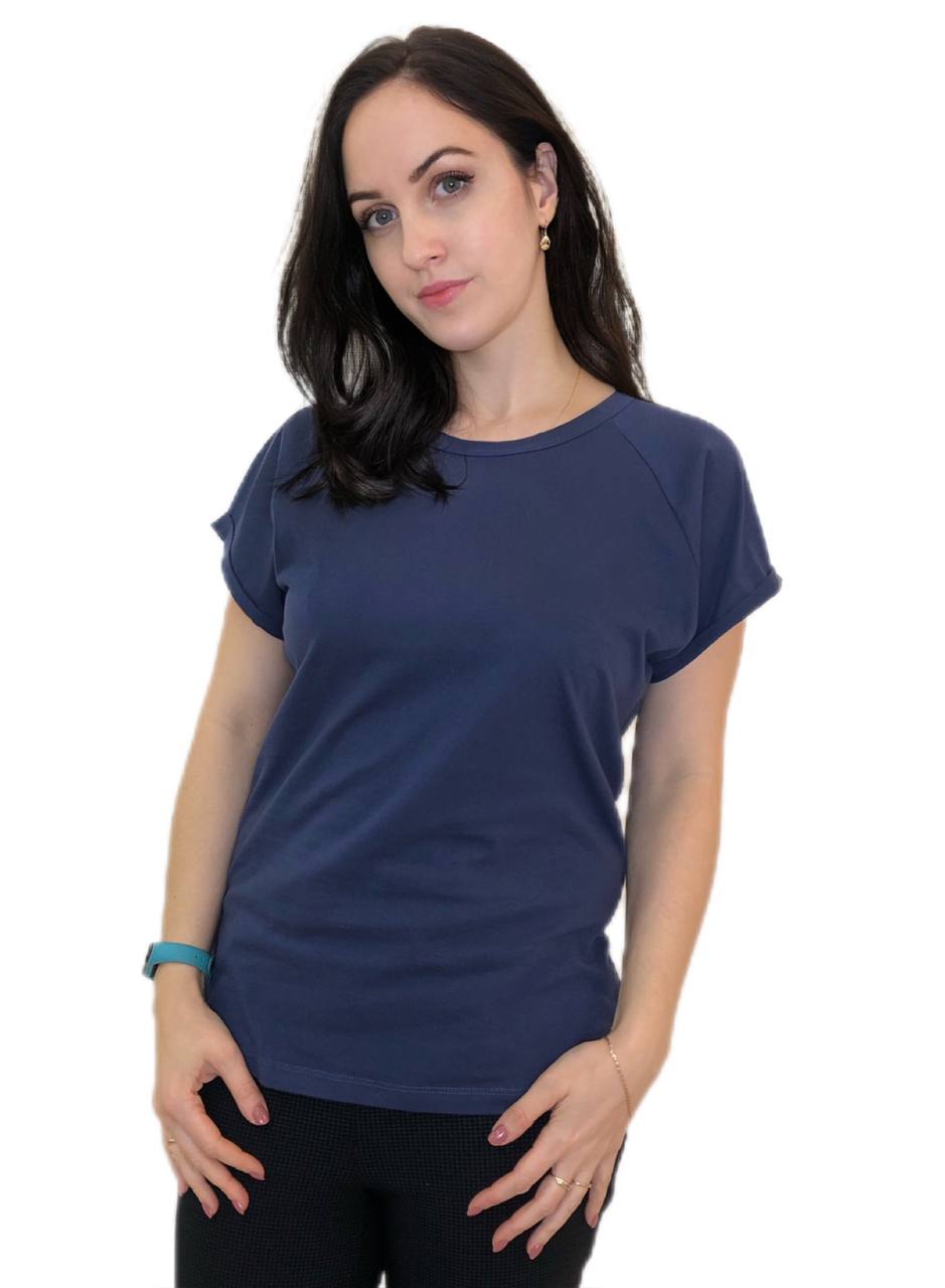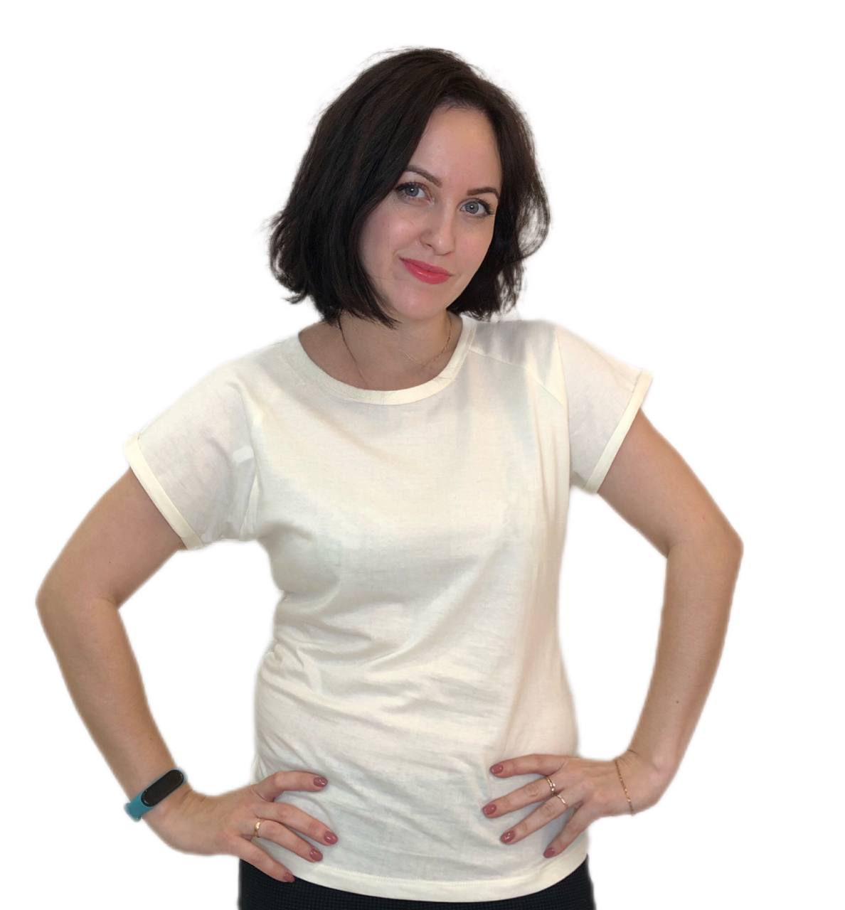 : Футболка женская прямого силуэта, свободная по форме, с коротким рукавом кимоно. Горловина увеличена, окантована бейкой шириной 1,5 см. Плотность 140гр/м2