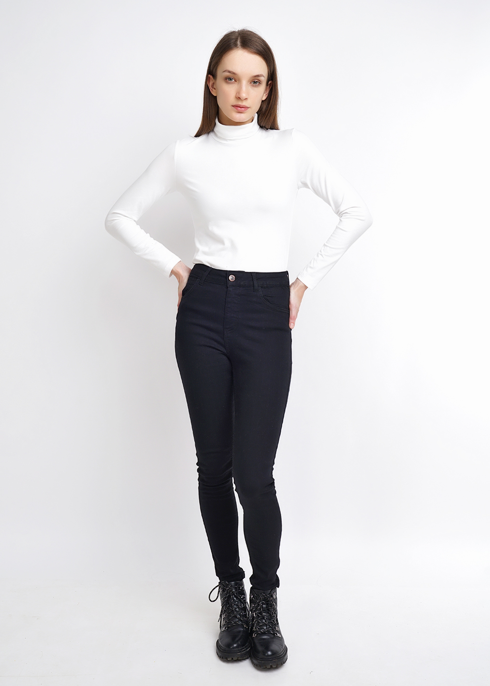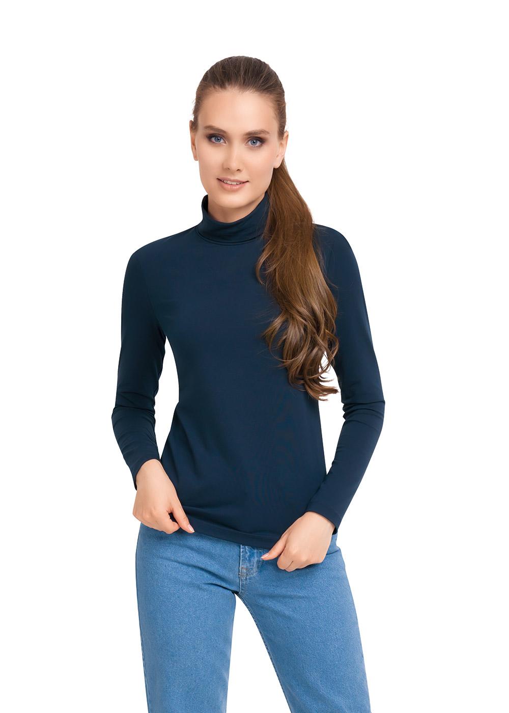 Водолазка на кулирной глади с лайкрой. Модель с длинным втачым рукавом, обработанным вподгибку. Горловина обработана воротником-стойкой, по низу - подгибка.