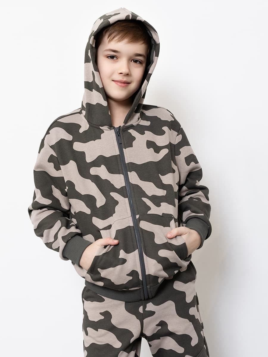 Жакет из трикотажного футера с теплым и нежным подчесом. Прямой свободный силуэт, уютный капюшон, длинные рукава с манжетами, вместительный карман-кенгуру, центральная застежка на молнию – очень комфортная модель. Свободу движений гарантирует спущенная линия плеча. Рекомендуем вашему мальчику!