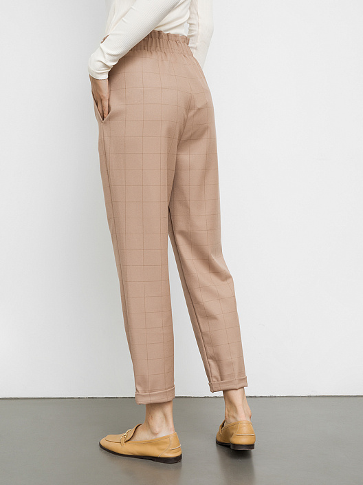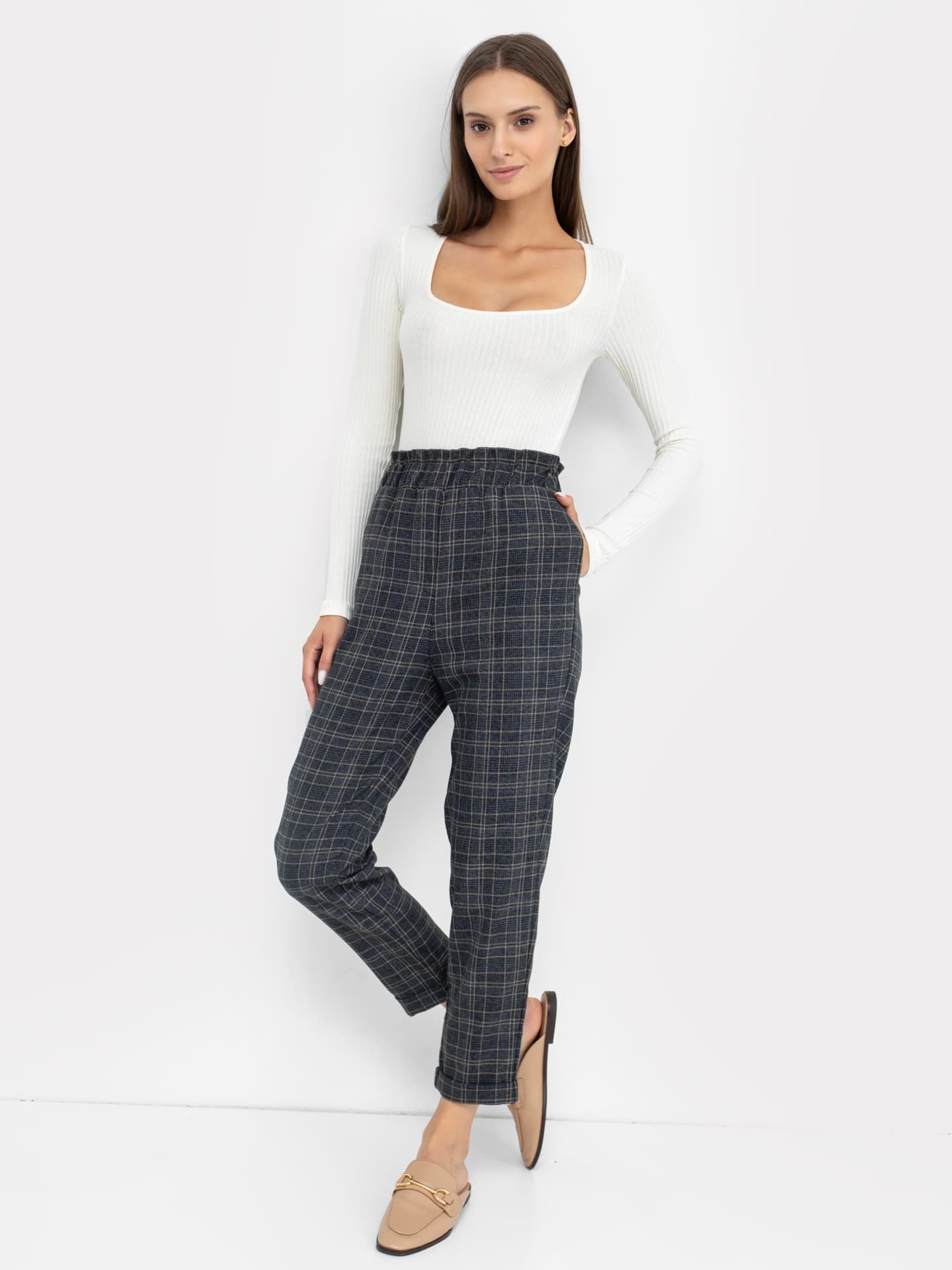 Прямые свободные брюки женские с высокой линией талии из высококачественного материала. В боковых швах обработаны карманы. Пояс отрезной с эластичной тесьмой внутри. Низ брюк с отворотами.