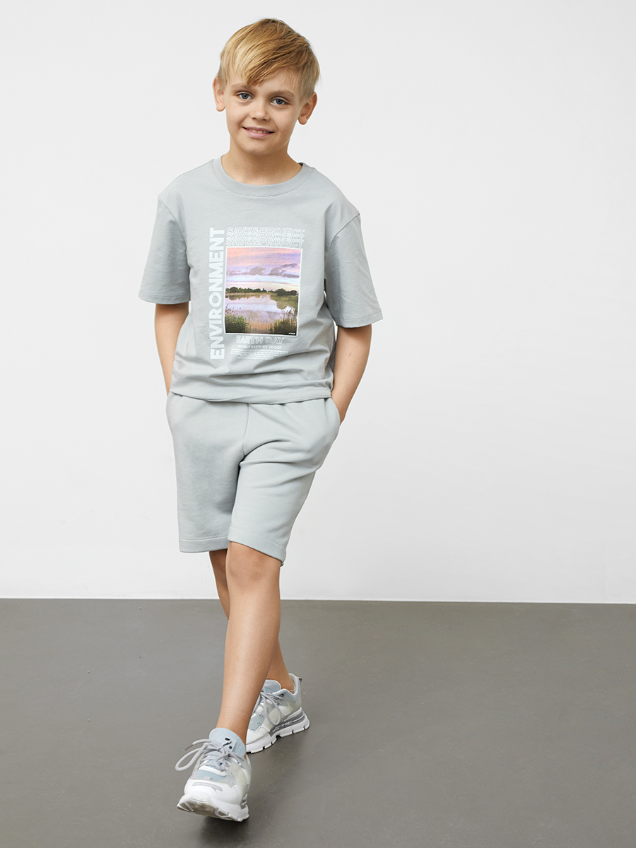 Шорты свободного силуэта для мальчиков. Выполнены из футера – мягкого, гигроскопичного и неприхотливого трикотажного полотна. Футер тонкий, без подчеса. Длина до колена. Боковые карманы добавляют практичности. Регулировать ширину по талии можно с помощью шнурка-завязки.