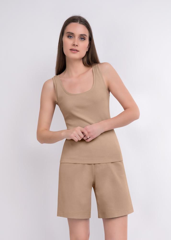 Универсальная майка из хлопкового полотна с добавлением эластана на широких беретелях.
