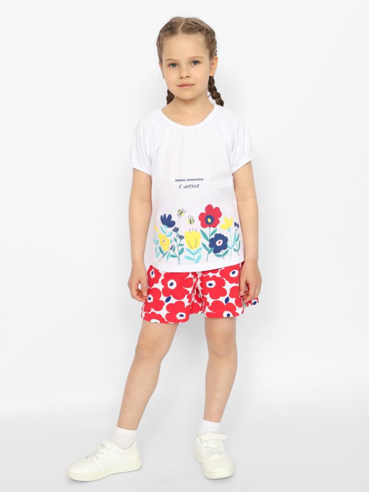 Кулирная гладь, 100% хлопок / Комплект для девочки - футболка и шорты. Футболка с рукавами реглан и резинкой по низу рукавов и горловине. Спереди декоративный принт-панно с блестящим эффектом. Шорты для девочки из набивного хлопка по талии на резинке с декоративной нашивной этикеткой.