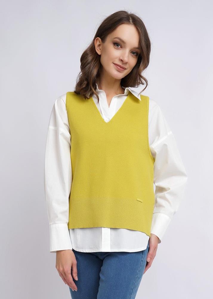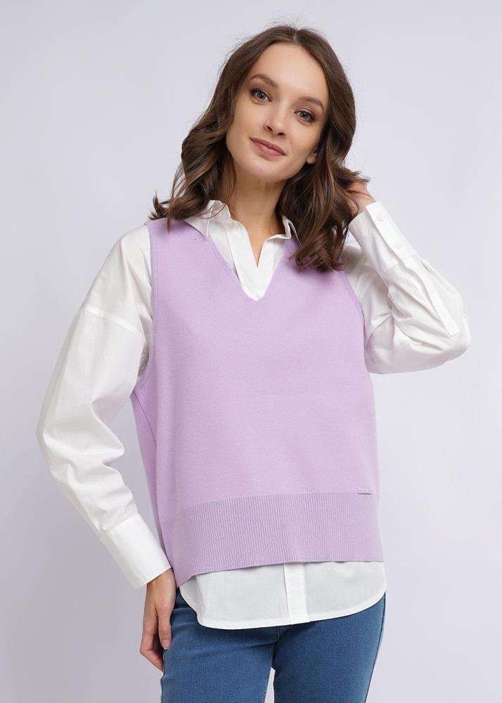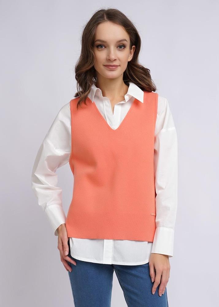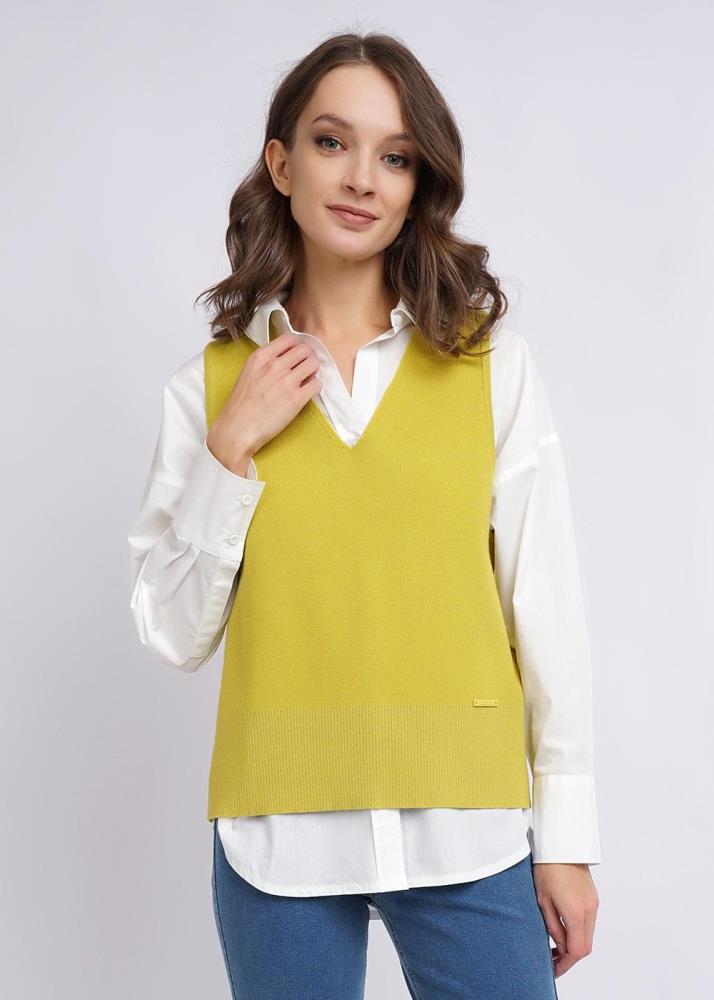 Жилетка из вискозной пряжи. V- образная горловина. Завершает дизайн нашивка.