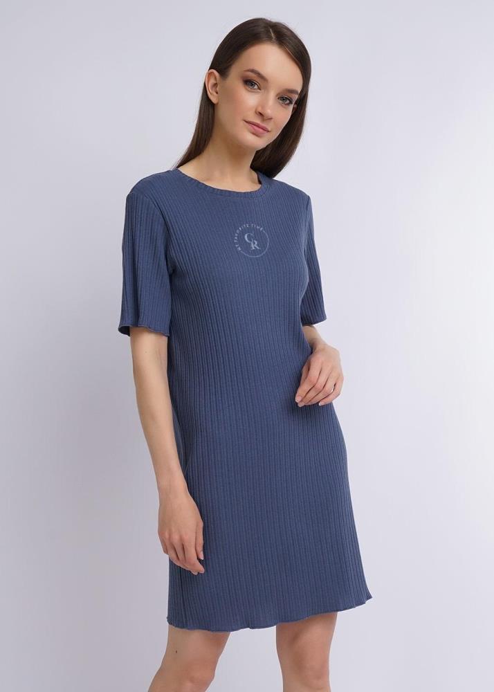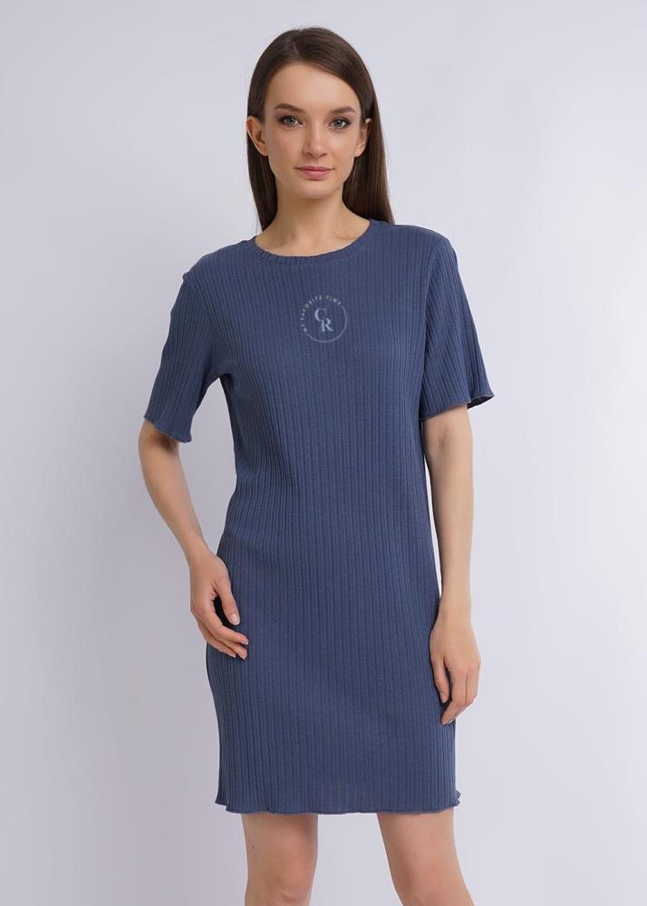 Платье свободного кроя из ажурного кашкорсе длиной миди. Круглая горловина и короткий рукав. Спереди принт.