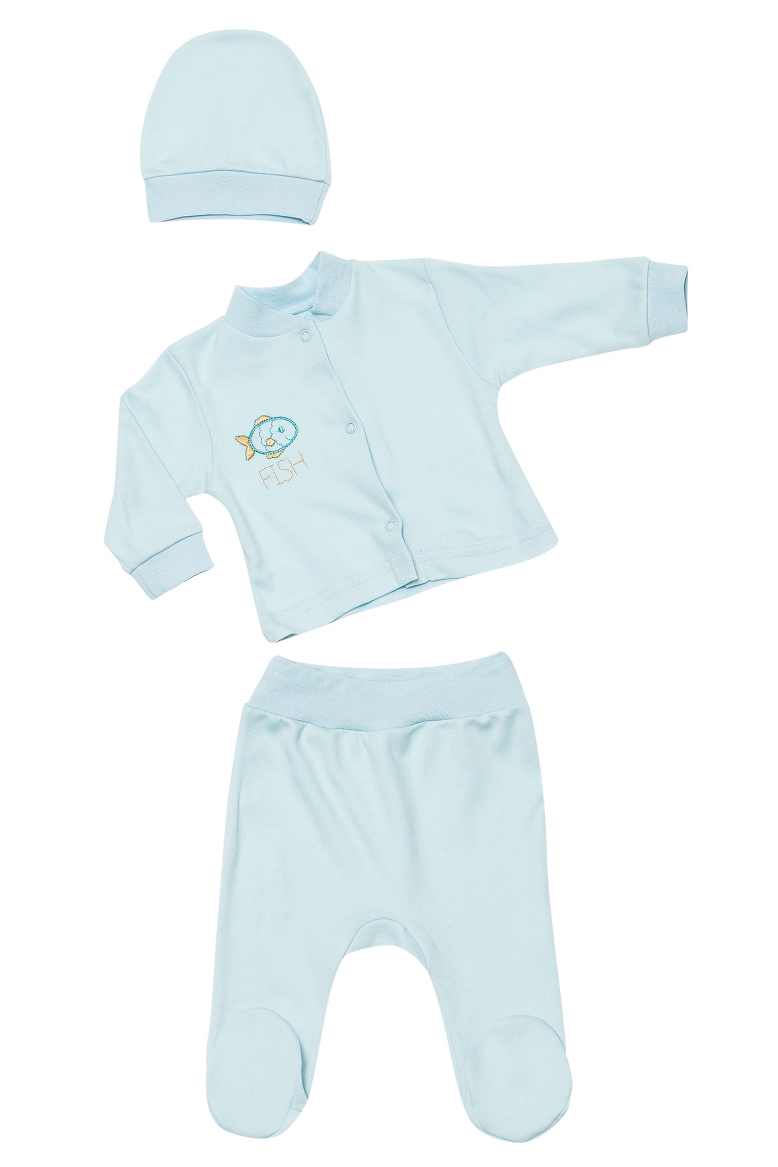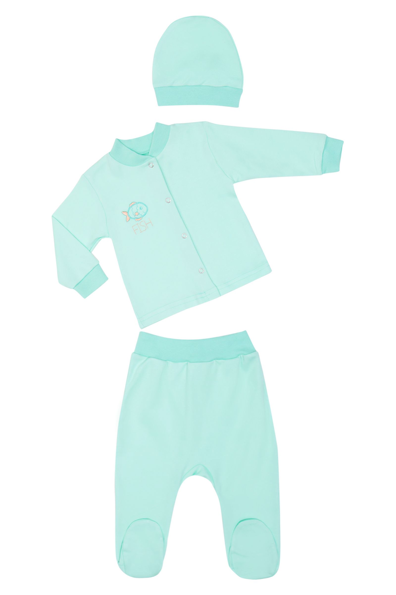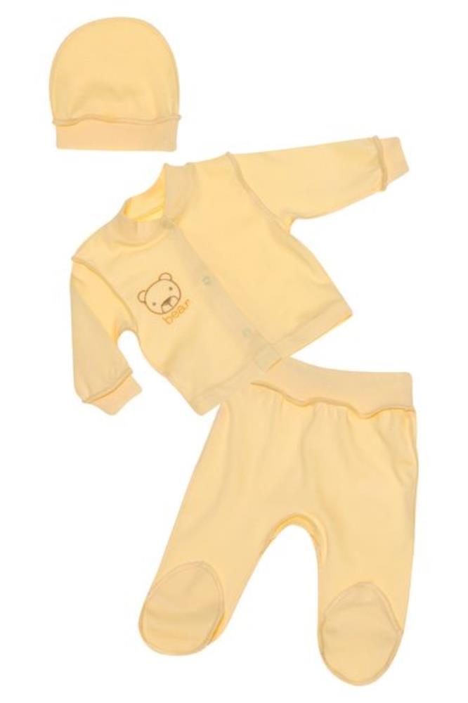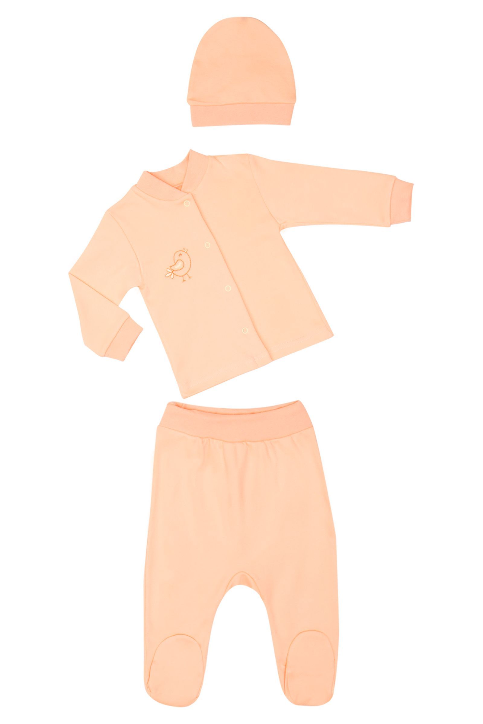 Однотонный комплект из тонкого трикотажа (100% хлопок): кофта на кнопках, ползунки с закрытыми ножками и шапочка в тон.