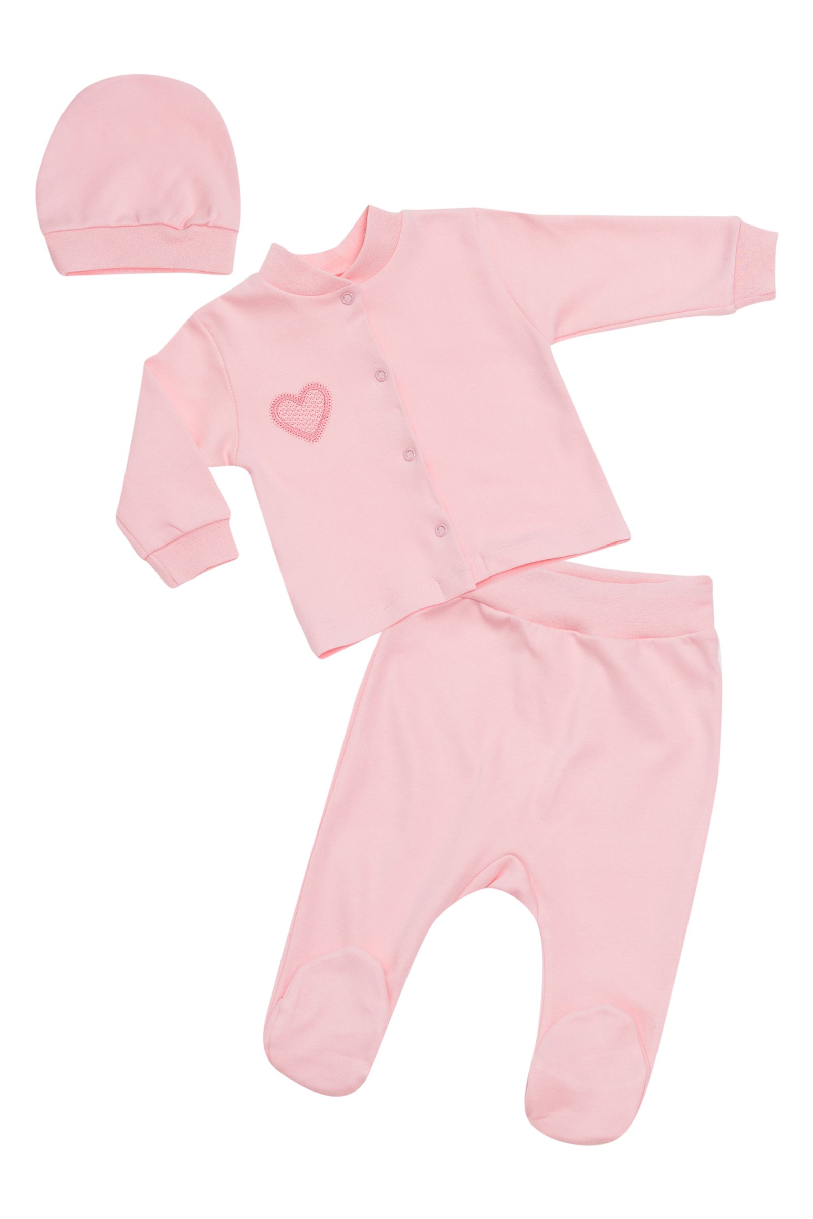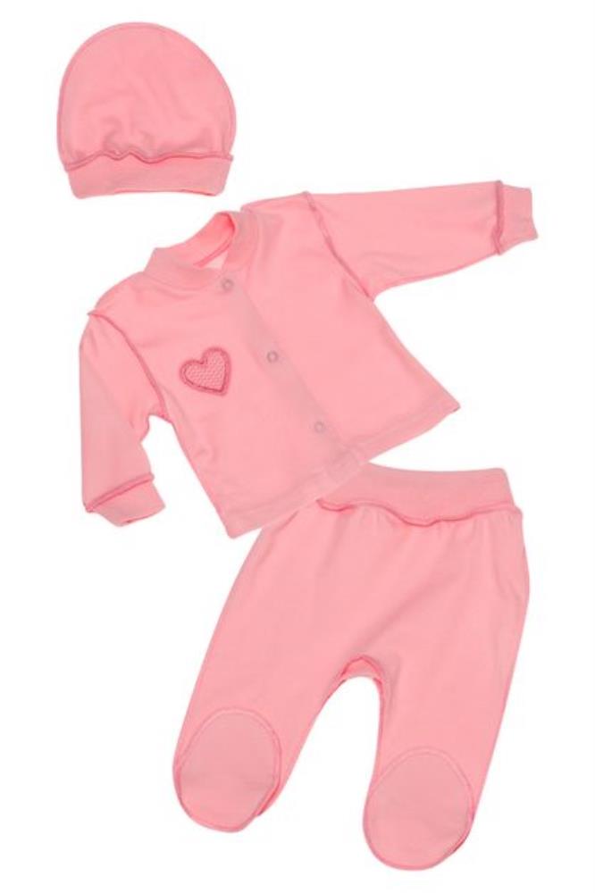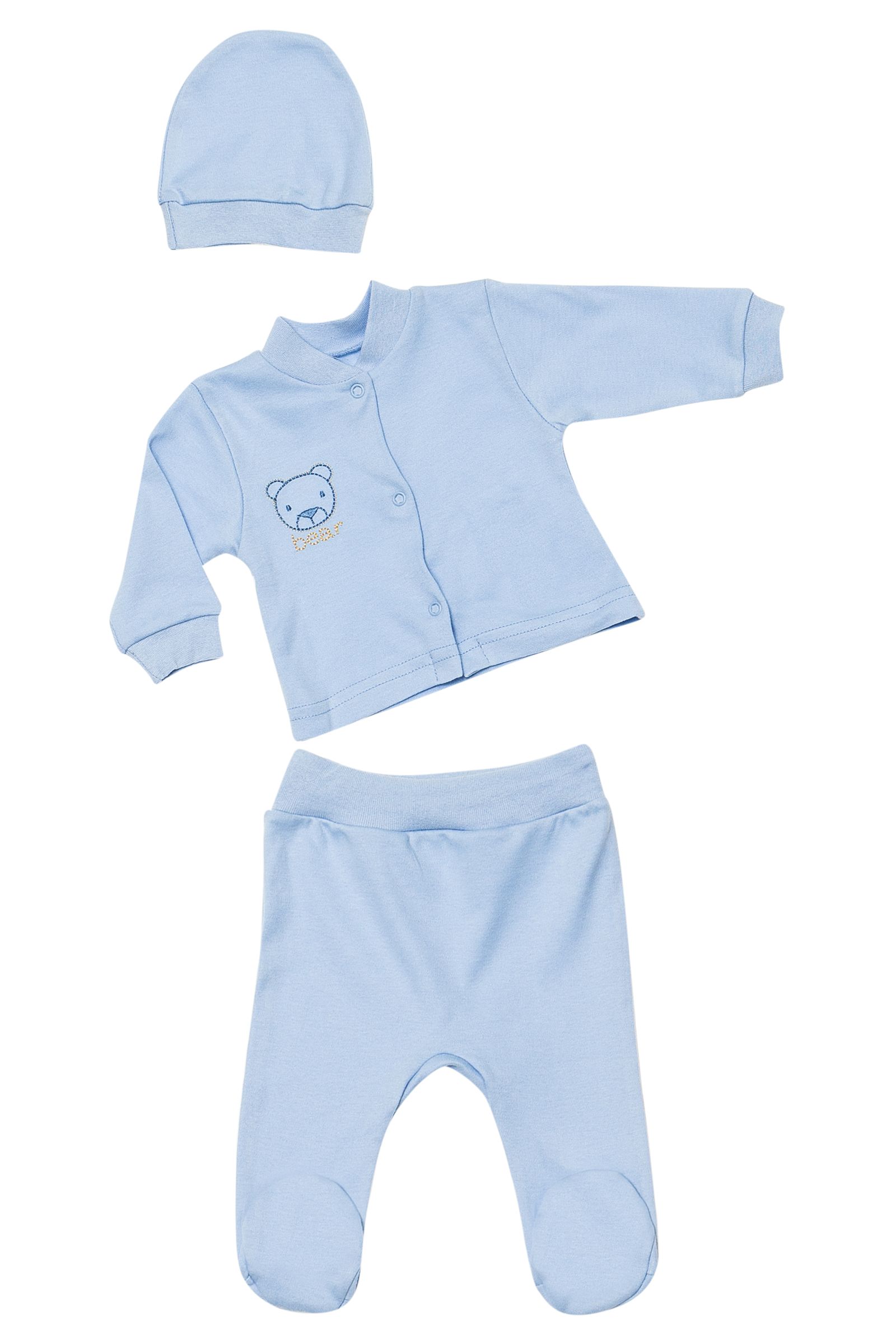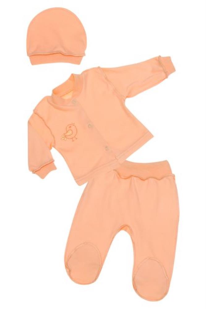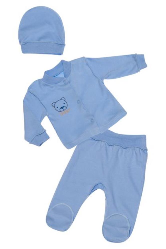 Однотонный комплект из тонкого трикотажа (100% хлопок): кофта на кнопках, ползунки с закрытыми ножками и шапочка в тон.