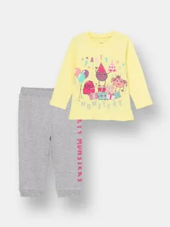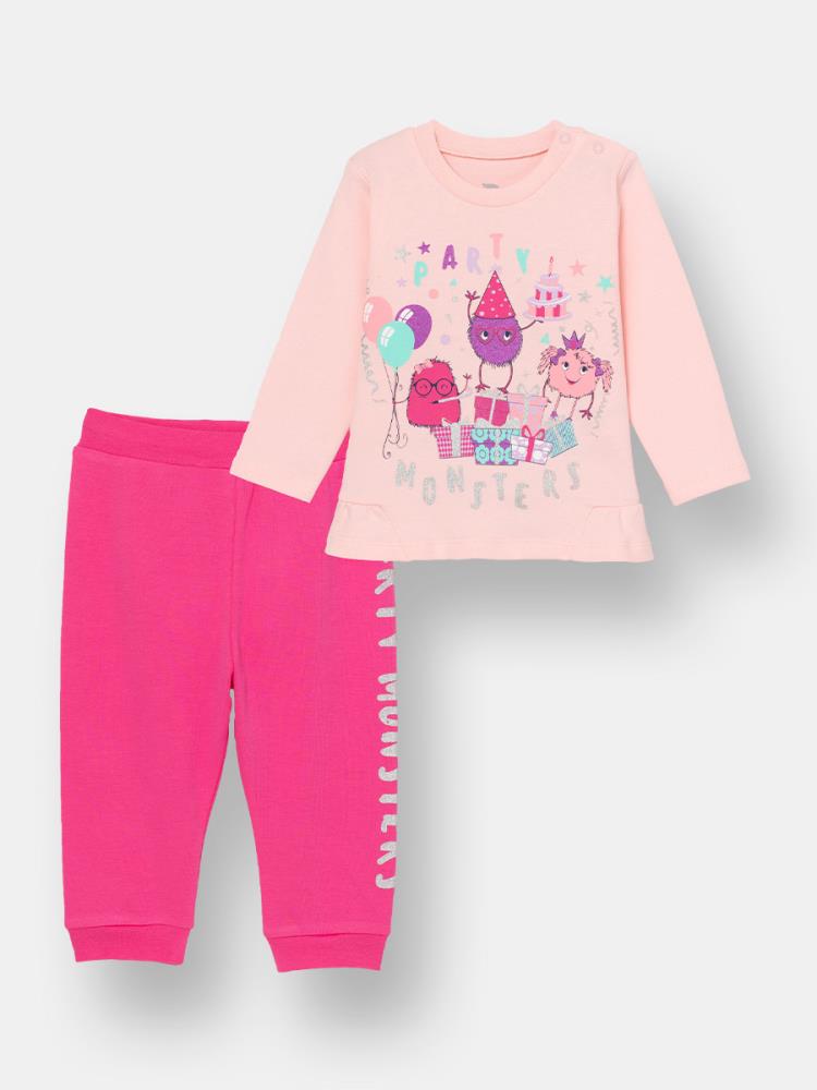Комплект для девочки состоит из джемпера и брюк. Джемпер с длинными рукавами и воланом со сборкой по низу. В плечевом шве обработана застежка на кнопки. Перед джемпера декорирован принтом. Брюки с притачным поясом и манжетами из полотна с эластаном. В области левого бокового шва брюки декориованы принтом.