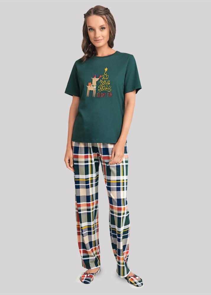 Комплект для дома из 100% хлопка. Футболка с коротким рукавом и круглой горловиной. По переду принт вспенка. Брюки с внутренней резинкой по талии и киперной лентой.