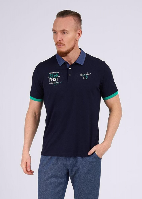 Футболка-поло мужская из хлопкового пике с кроеным воротником. Модель с коротким втачным рукавом и с функциональной планкой на пуговицы. Дополнено контрастными вязаными отделками и закрепками по боковым разрезам, принтом и шевроном.
