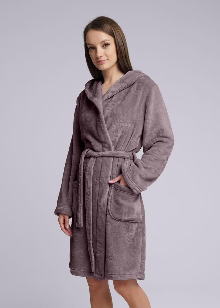 Халат прямого кроя из велсофта с длинным рукавом и поясом. Модель дополнена капюшоном и карманами для дополнительного комфорта.