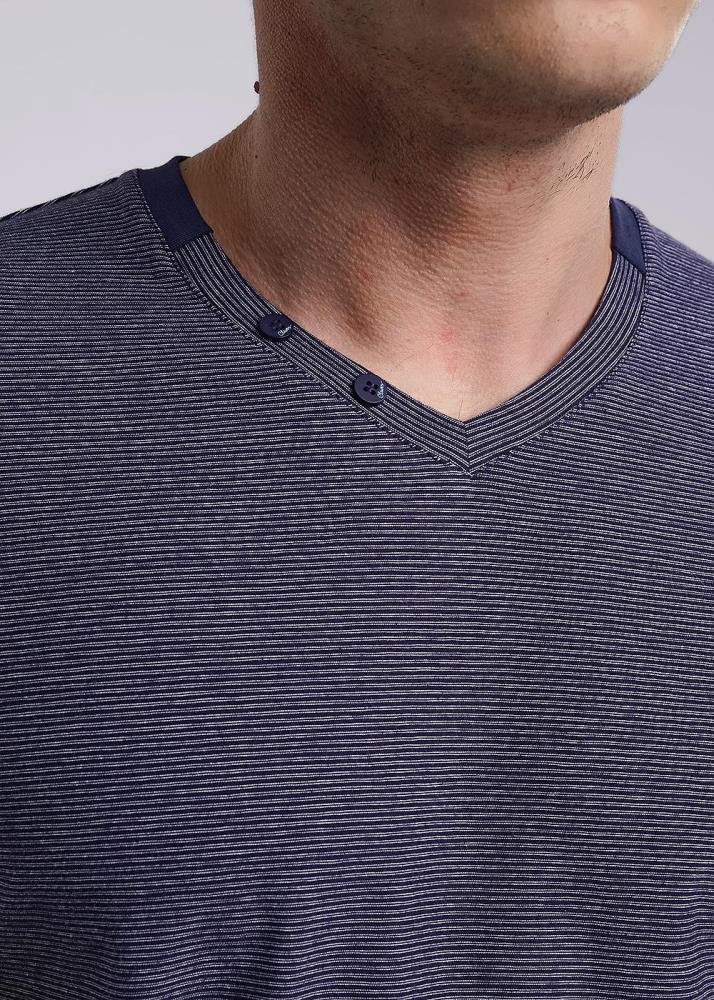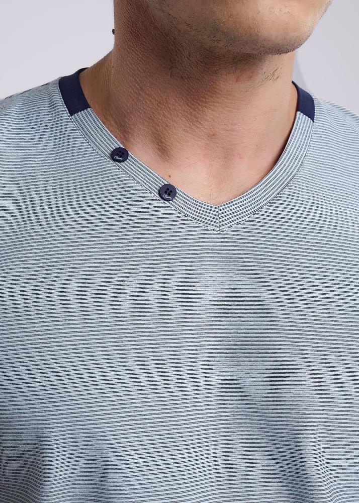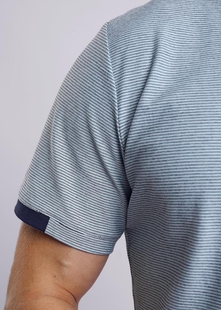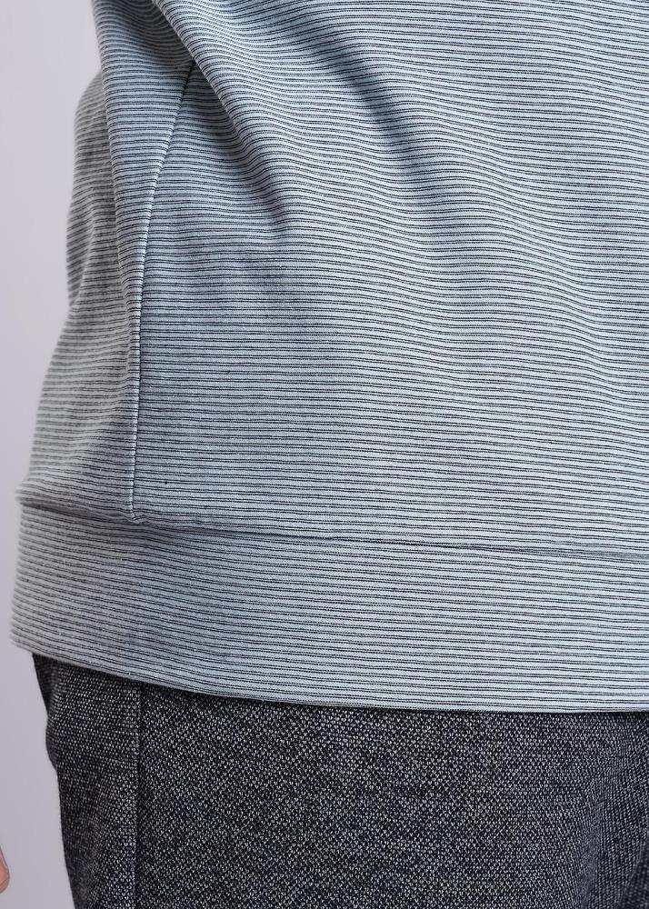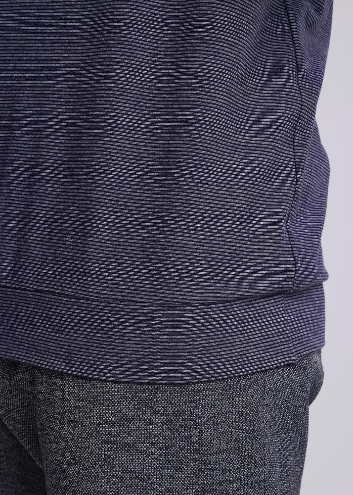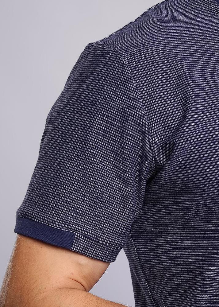 Футболка мужская из хлопкового полотна с эластаном в тонкую полоску. Изделие на поясе оформлено контрастными вставками по горловине и манжетам, а так же прорезиненным принтом и фирменной фурнитурой. Модель удобная и практичная подойдет на каждый день.