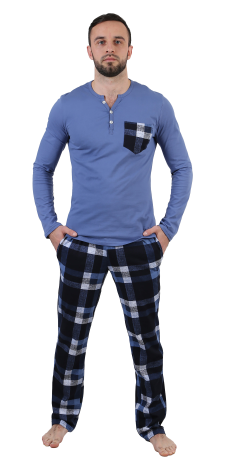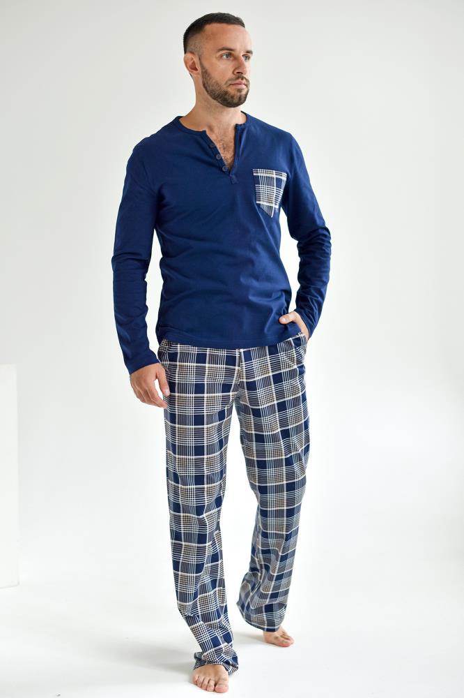 Пижама мужская состоит из футболки и брюк. Футболка с длинным втачным рукавом. Круглый вырез горловины на полочке и имитация планок окантованы бейкой с застежкой на петли и пуговицы. На полочке нагрудный карман. Футболка выполнена из гладкокрашеного полотна. Брюки прямого силуэта с боковыми карманами в швах с цельнокроеным поясом на резинке.