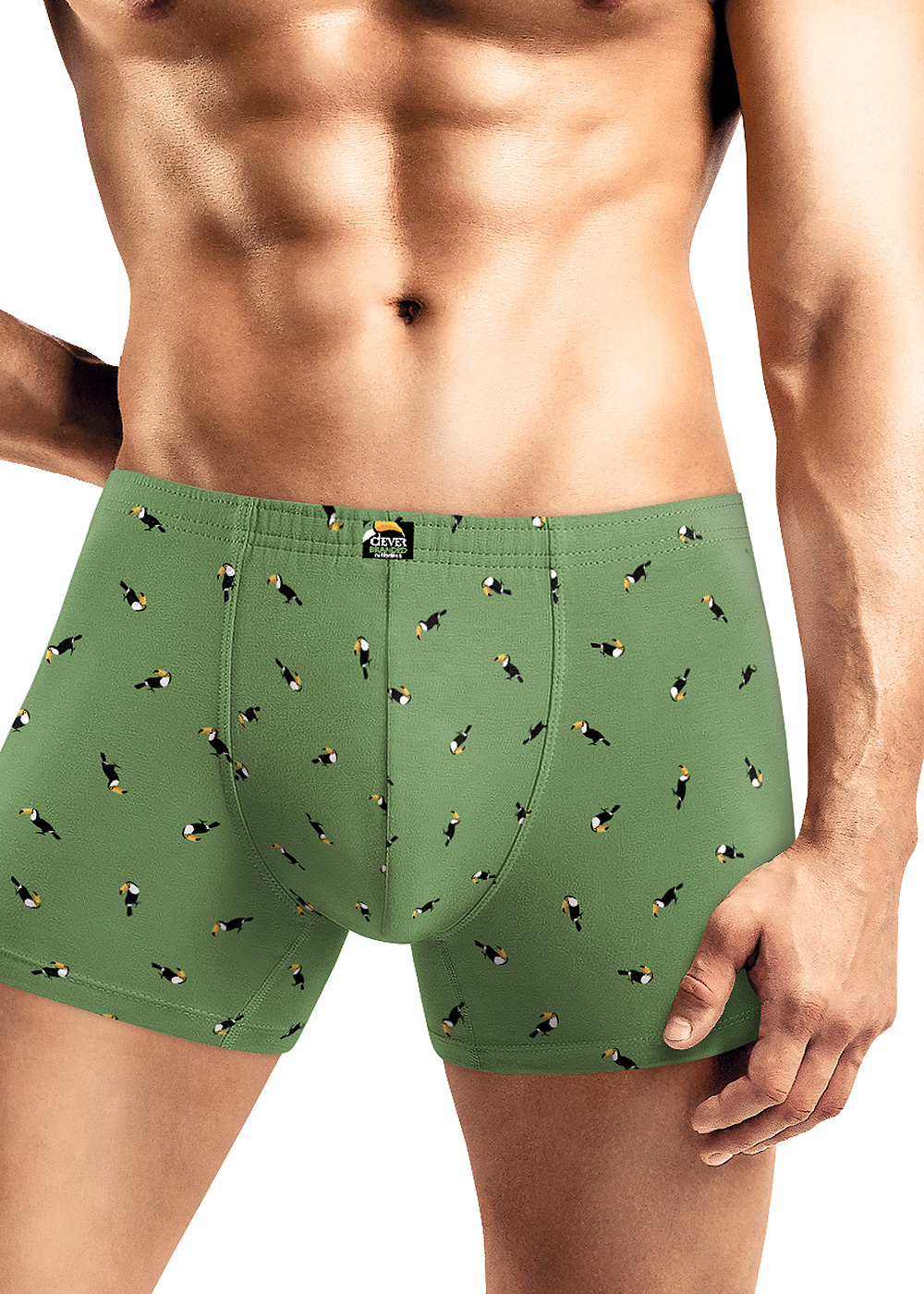 Шорты удлиненные комфортной посадки на тканевом поясе, выполнены из оригинального полотна в дизайнерскую набивку Туканы. Трусы дополнены фирменным жаккардовым логотипом.