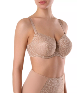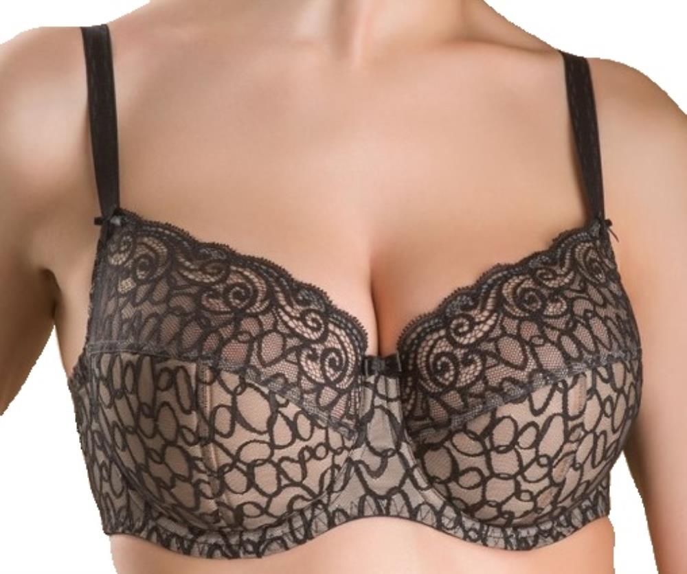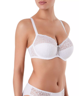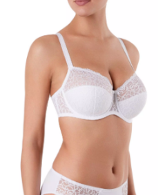 Бюстгальтер из эластичного полотна, неэластичного кружевного полотна и неэластичного кружева. Нижние детали чашек на подкладке из дублированного материала, верхние детали чашек на подкладке из неэластичного сетчатого полотна, деталь ластовицы и отрезные д